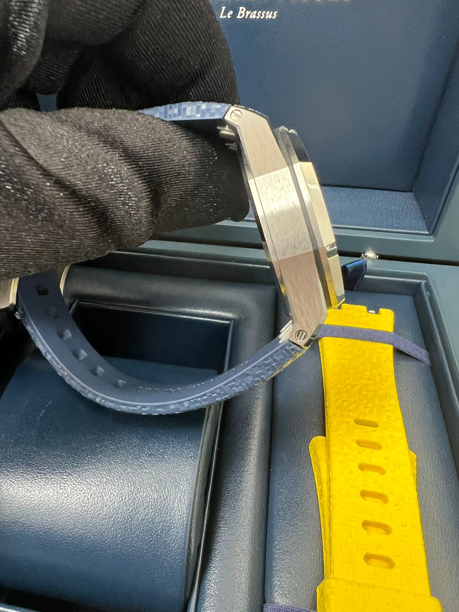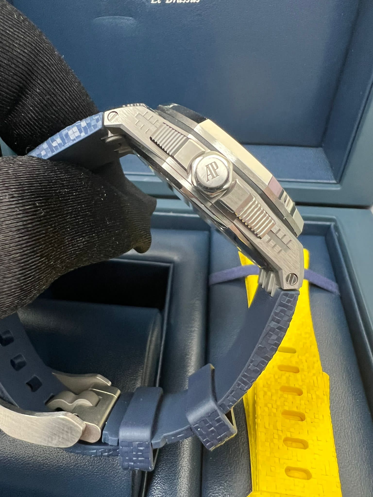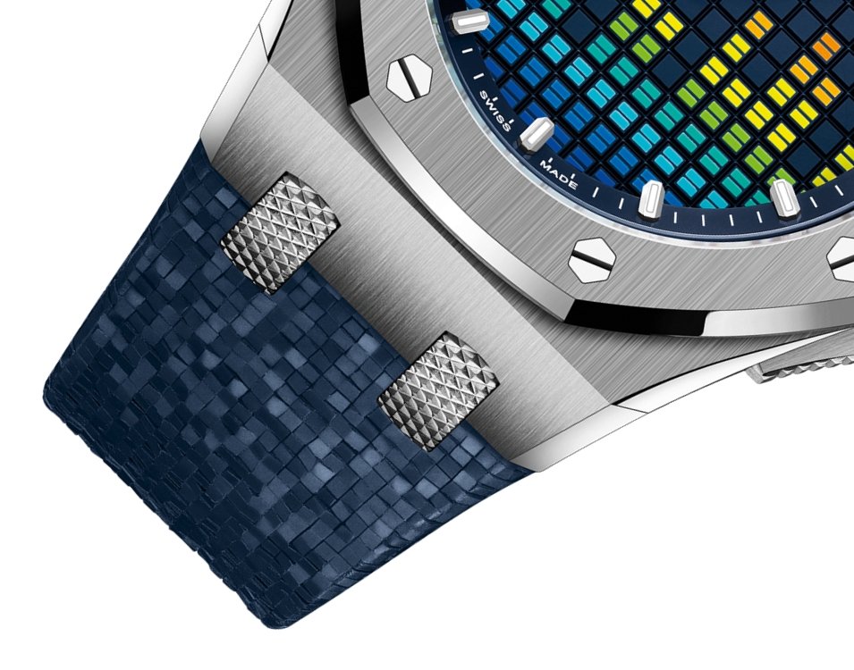 |   The aesthetic of this 37 mm titanium Royal Oak Offshore Selfwinding limited edition is inspired by music, its dial representing a VU meter and its push-piece guards evoking mixer faders. A blue textured interchangeable rubber strap – a first for the smaller wrists – complements the overall design. Titanium case, glareproofed sapphire crystal and caseback, screw-locked crown. Blue dial with printed VU meter, white gold applied hour-markers and Royal Oak hands with luminescent coating. Blue rubber strap with “constellation” texture, titanium AP pin buckle and interchangeable strap system. Additional turquoise blue, yellow and green rubber strap with “constellation” texture.   |