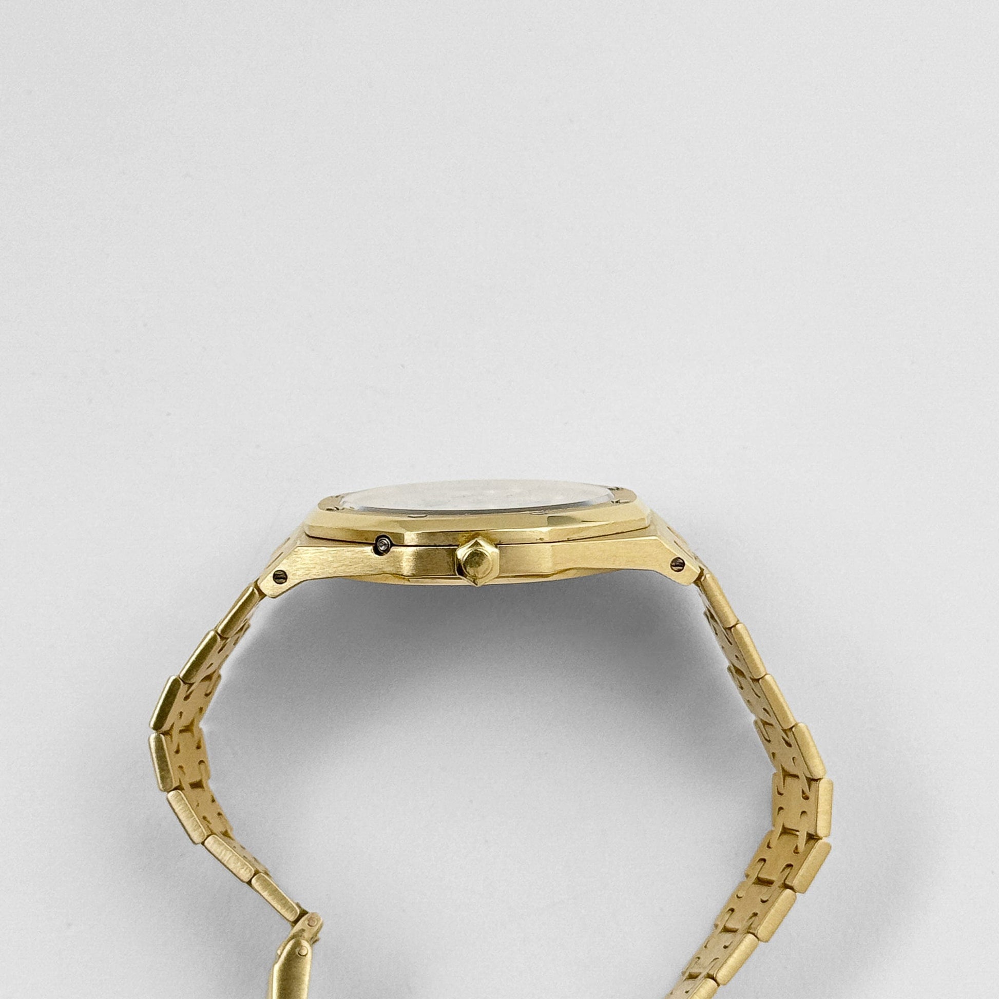 The gold-tone dial, creates a warm, monochromatic elegance, complemented by applied yellow gold hour markers. The perpetual calendar complication displays the day, date, month, moon phase, and leap year cycle, ensuring precision without the need for manual adjustments for leap years. At its heart is the ultra-thin Caliber 2120/2800, one of the finest self-winding perpetual calendar movements ever produced. Revered for its historical significance and impeccable craftsmanship, the 25654BA remains an icon among vintage Royal Oak Perpetual Calendars, a prized piece for collectors and connoisseurs of fine watchmaking.