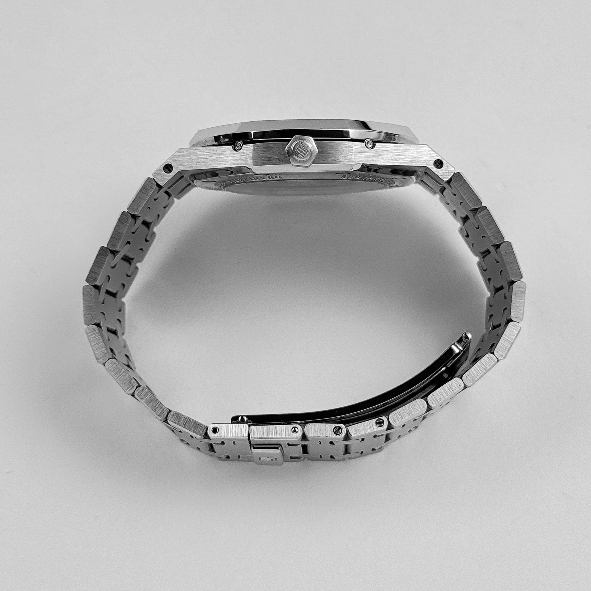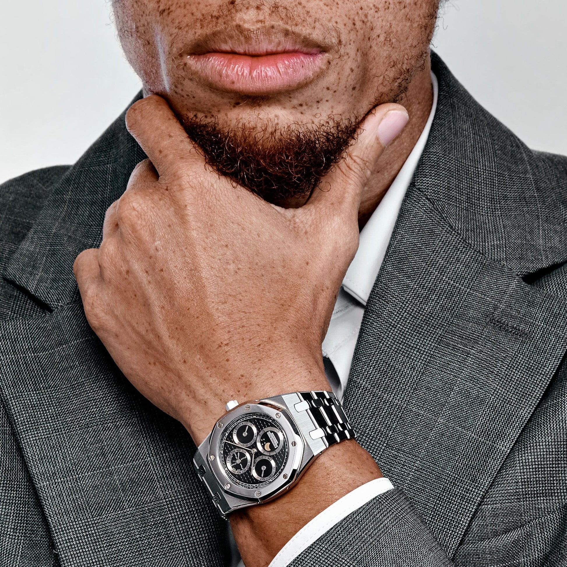 The Audemars Piguet Royal Oak Perpetual Calendar 25820SP marries sporty elegance with horological sophistication. Its 39 mm stainless steel case is elevated by a polished platinum bezel and platinum links, offering a striking two-metal contrast. The black “Grande Tapisserie” dial hosts a full perpetual calendar: day, date, month, moonphase, and leap year indicators—all arranged cleanly within four subdials for instantaneous legibility. AP’s classic white-gold hands and indices complete the refined aesthetic.