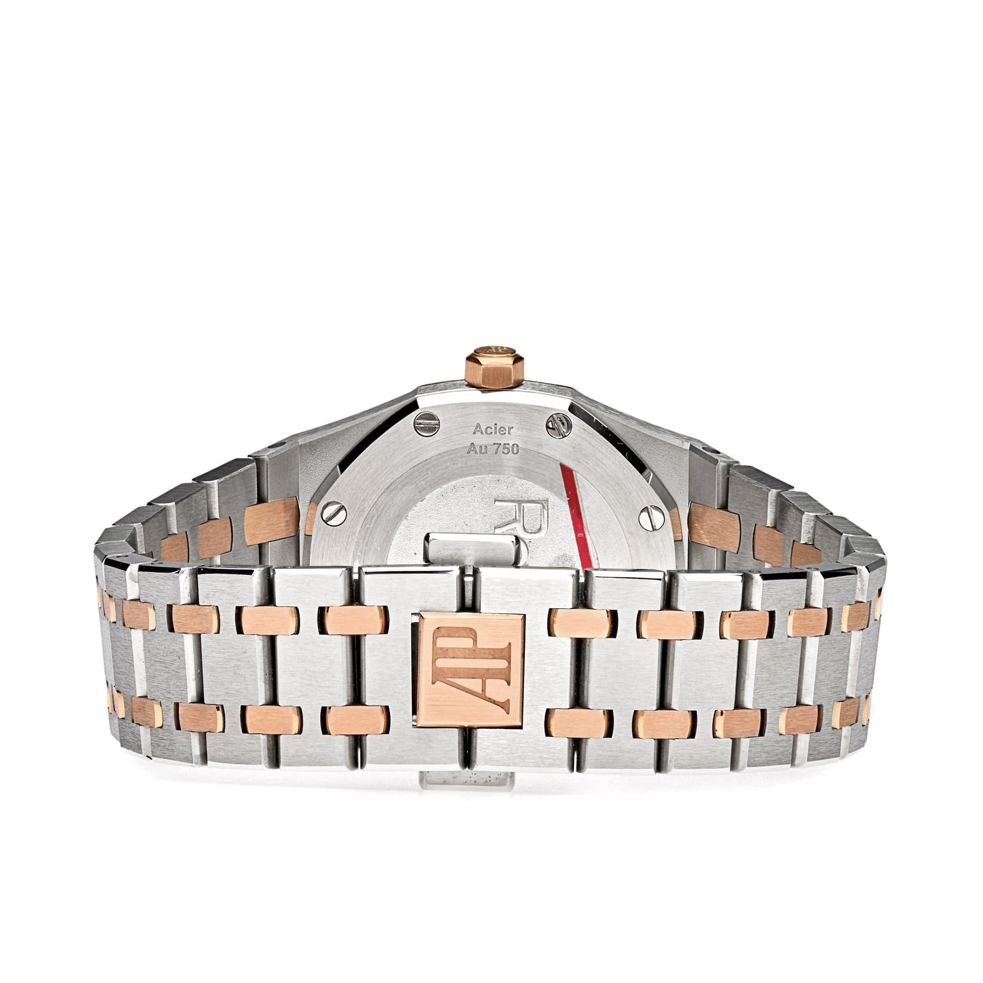 The AP Royal Oak Quartz is designed in a feminine 33mm stainless steel case and 18k rose gold bezel. It features the recognizable 'Grand Tapisserie' pattern on the rose gold dial, rose gold markers and hands, and date functionality set at 3 o'clock. The watch is complimented by a rose gold & stainless steel bracelet with 18-carat rose gold AP folding clasp.