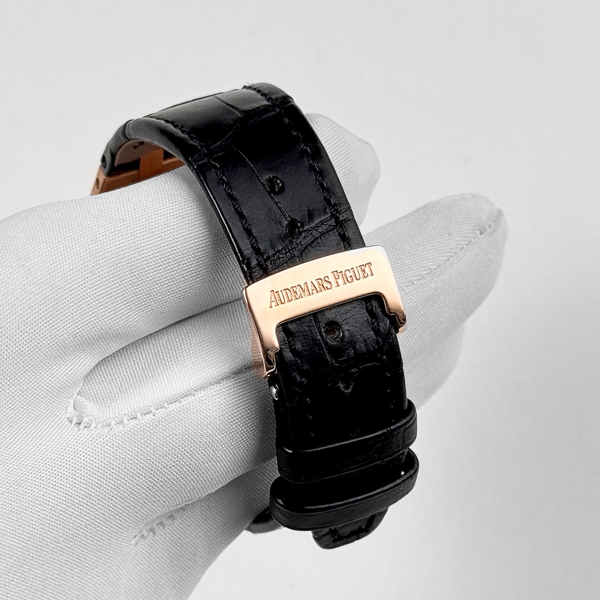 The Audemars Piguet Royal Oak Selfwinding is a stunning watch that features a 37mm case diameter and rose gold case material. The dial displays a black "Grande Tapisserie" pattern and it comes on a hand-stitched, large square scale, black alligator strap with 18-carat rose gold AP folding clasp.