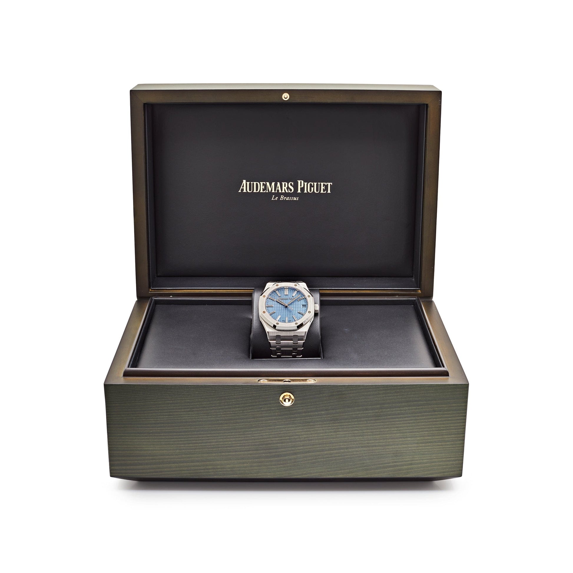 Introducing the Audemars Piguet Royal Oak Selfwinding 15510BC.OO.1320BC.01. The 41mm case is made of 18k white gold and complements the Grande Tapisserie dial in blue with a date feature at 3 o’clock. Luminescent white gold hand and diamond hour markers work with the Sapphire glare-proofed crystal for optimal legibility in any condition. An exhibition case back gives a glimpse at the Calibre 4302 in action. Fitted on an 18k white gold bracelet with an AP folding clasp, this instant classic is a must-have addition to your collection.