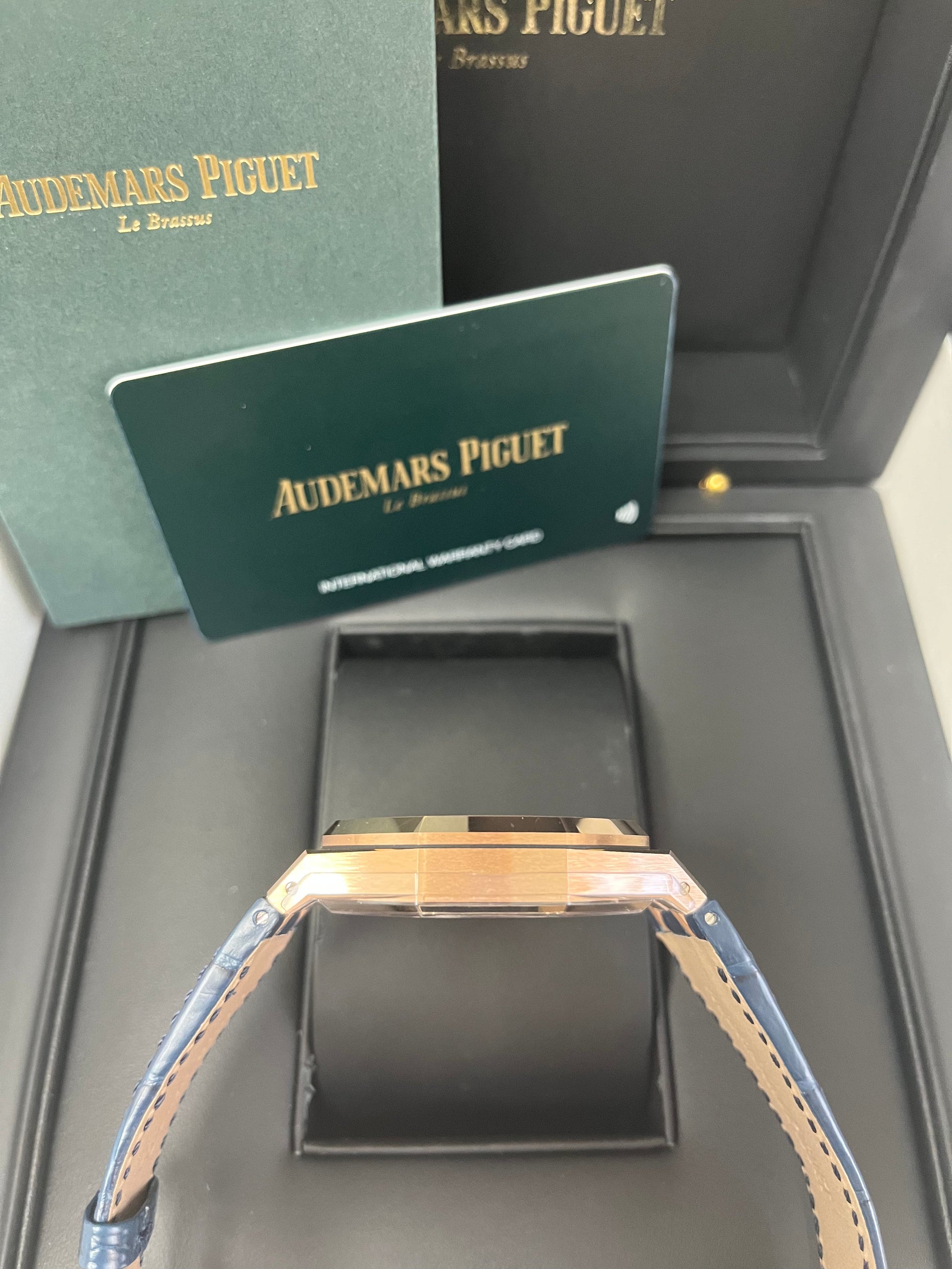 “Bleu nuit nuage 50” dial with “Grande Tapisserie” pattern, pink gold applied hour-markers and Royal Oak hands with luminescent coating.