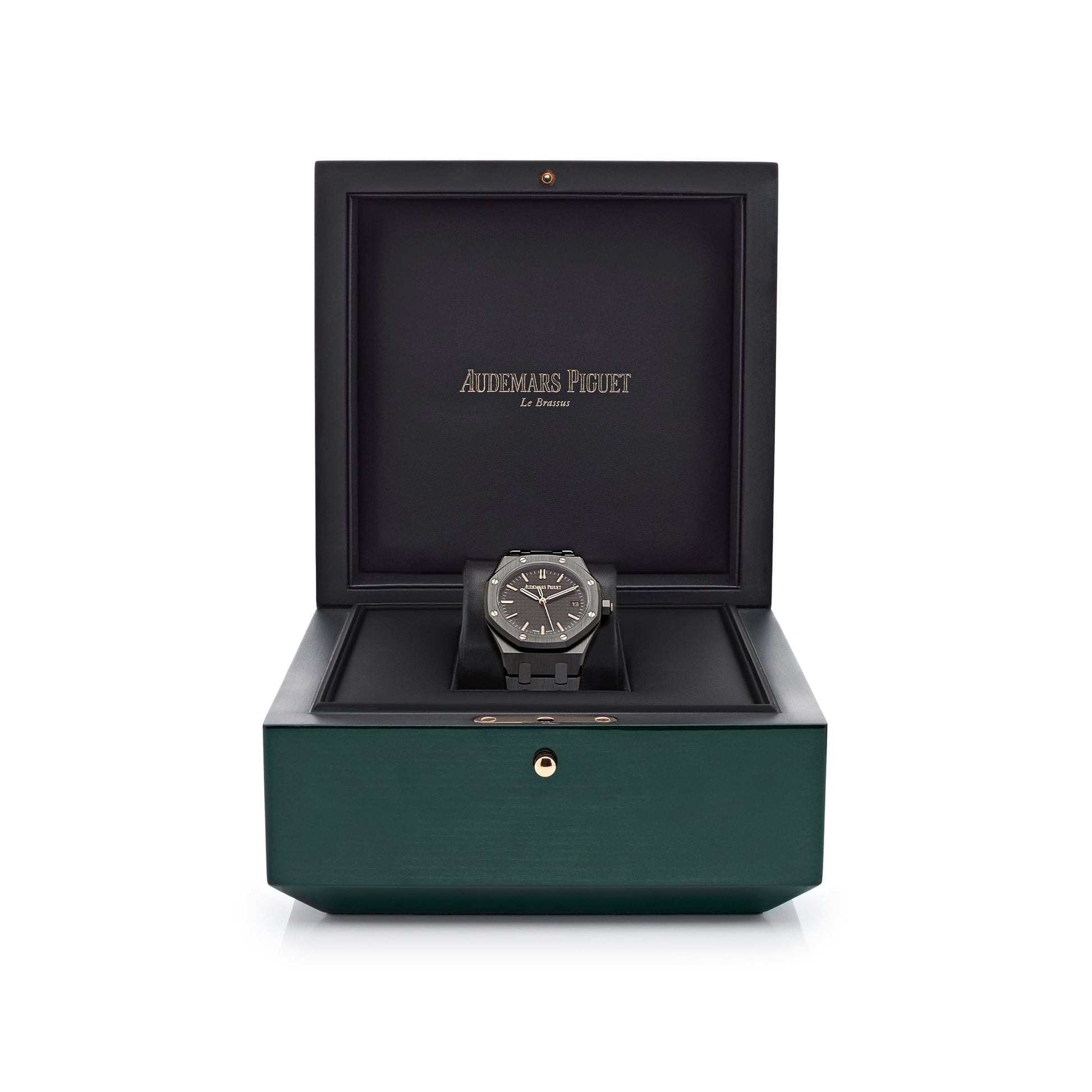 The Audemars Piguet Royal Oak Selfwinding 77350CE.OO.1266CE.01 is a bold and contemporary expression of the iconic Royal Oak design. Crafted entirely from black ceramic, the 34mm case and integrated bracelet exude a sleek, modern aesthetic while offering exceptional durability and scratch resistance. The combination of polished and satin-brushed finishes enhances the ceramic’s dynamic appearance, showcasing Audemars Piguet’s meticulous craftsmanship.
