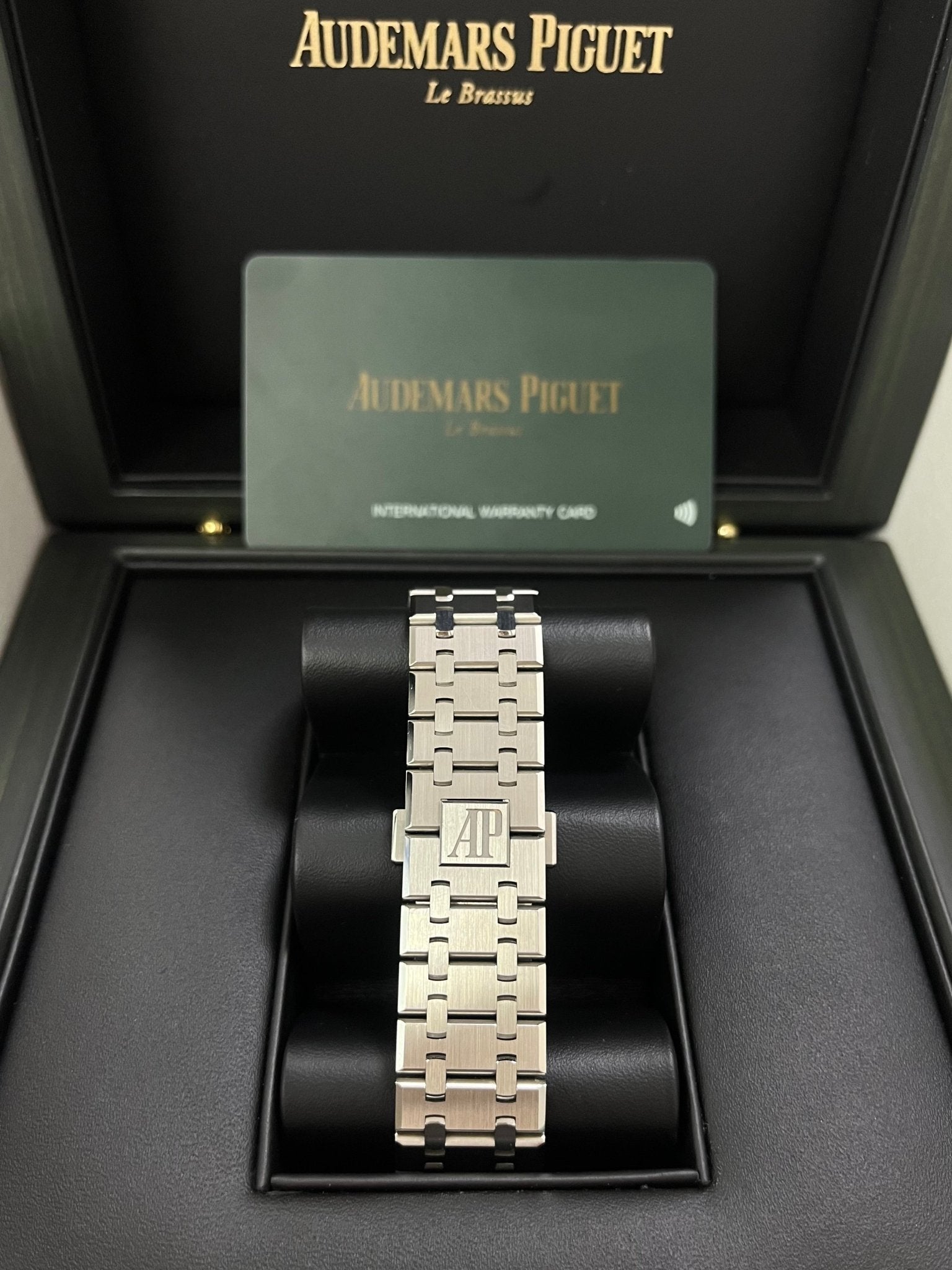 Black dial with “Grande Tapisserie” pattern, black counters, white gold applied hour-markers and Royal Oak hands with luminescent coating.