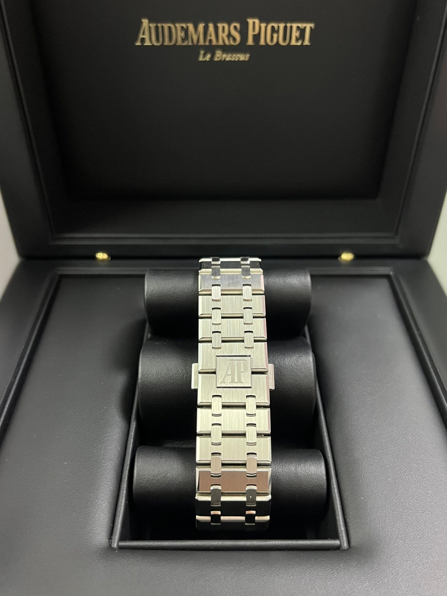41mm stainless steel case, 10.4mm thick, sapphire crystal back, glare-proof sapphire crystal, blue dial with Grande Tapisserie pattern, white gold applied hour-markers and Royal Oak hands with luminescent coating and calibre 4302 self-winding movements with hours, minutes, center seconds, and date, approximately 70 hours of power reserve, stainless steel bracelet, AP folding buckle. Water-resistant up to 50 meters.