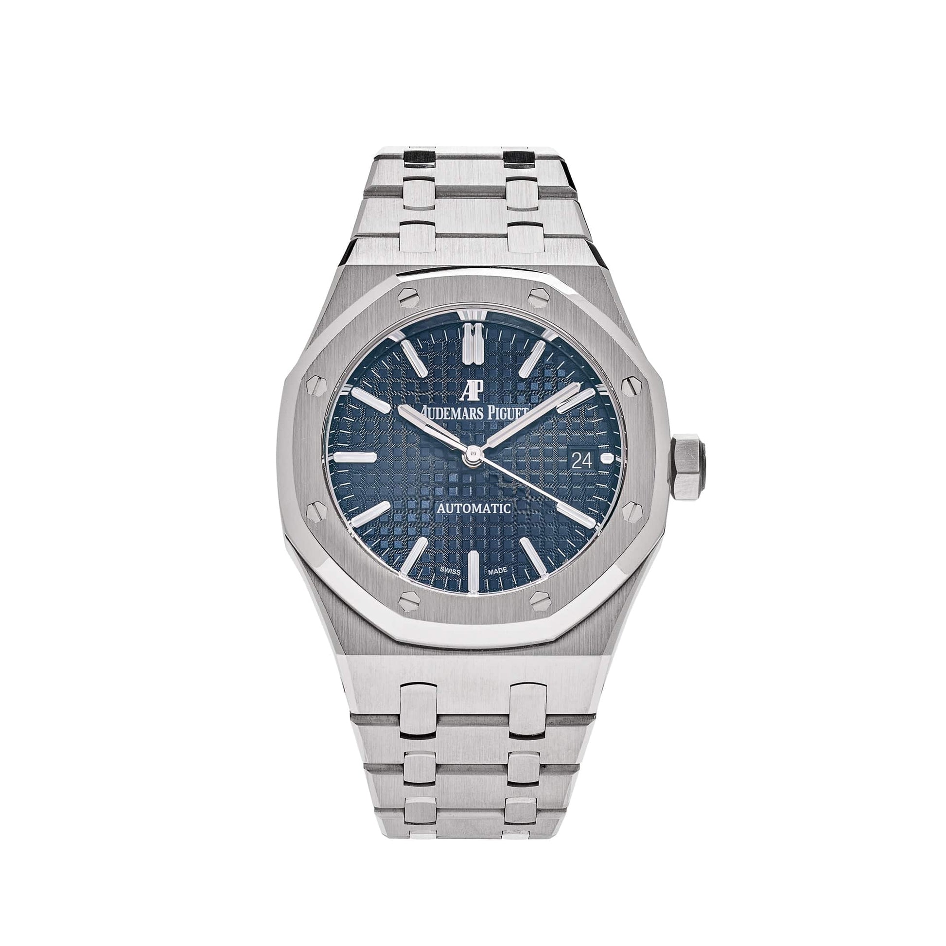 This Royal Oak Selfwinding is designed in a 37mm case crafted in stainless steel with a smooth stainless steel bezel. It features the 'Grande Tapisserie' pattern on the blue dial, luminous markers and hands, glareproof sapphire-crystal and caseback, and a date set at 3 o'clock. The watch is complimented by a stainless steel bracelet with AP double folding clasp.