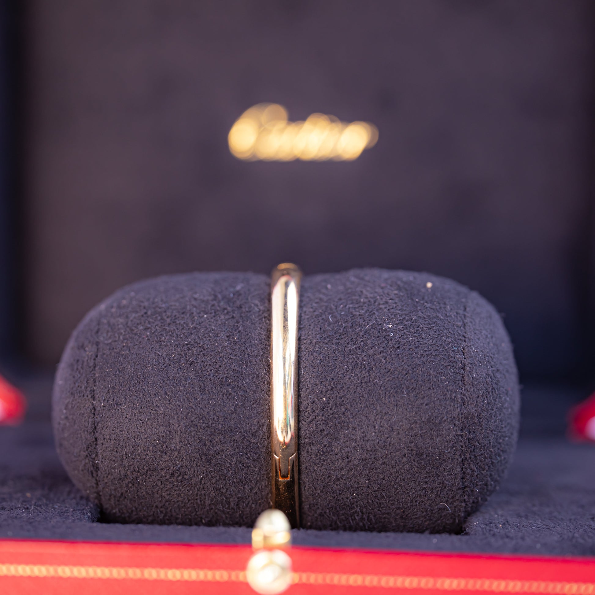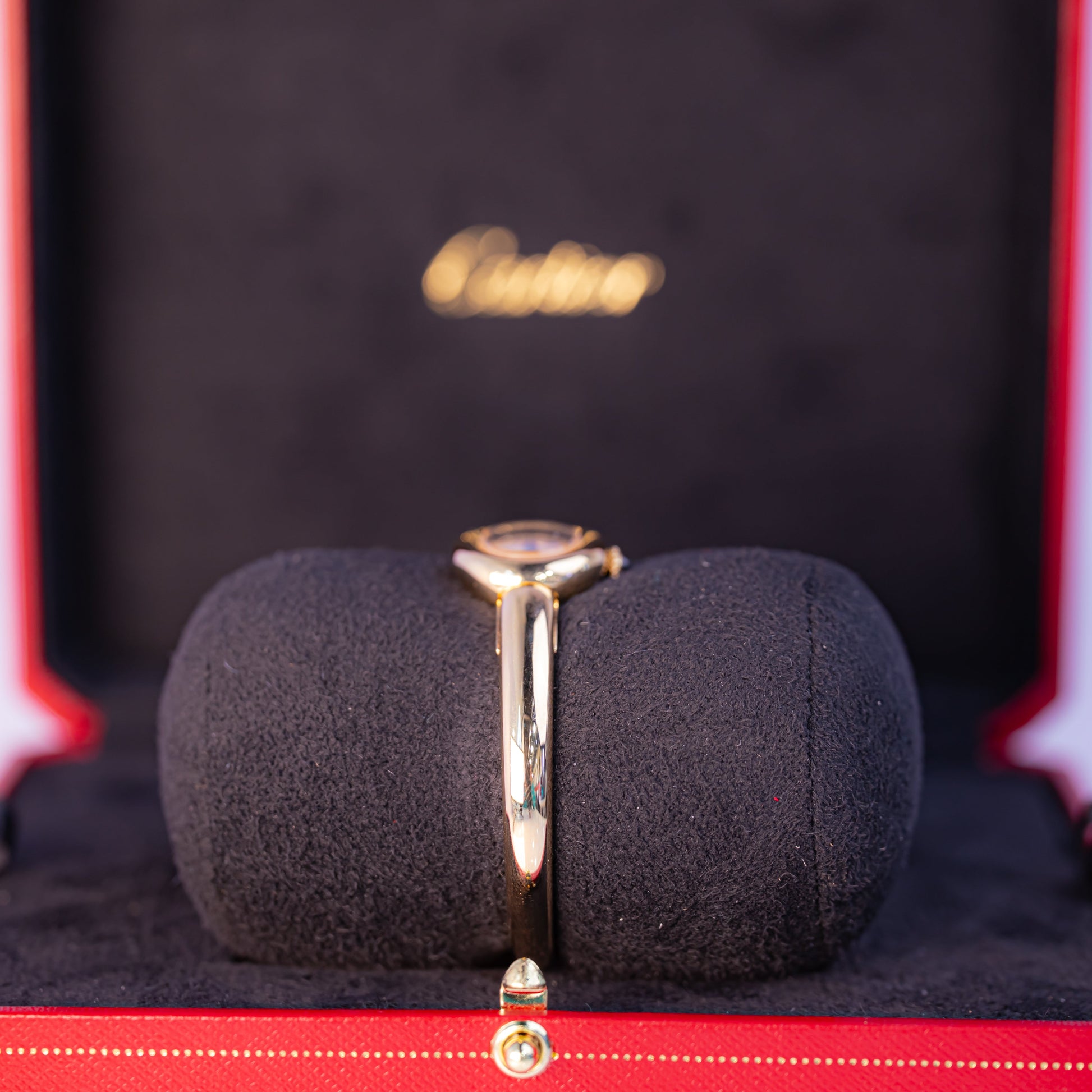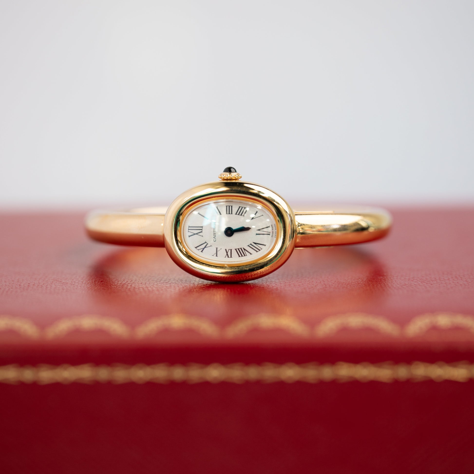 Baignoire de Cartier watch, mini model, size 16, quartz movement. 18K yellow gold (750/1000) case. 18K yellow gold (750/1000) beaded crown set with a sapphire cabochon. Silvered dial, blued-steel sword-shaped hands, sapphire crystal. 18K yellow gold (750/1000) rigid bracelet. Length: 24.6 mm, width: 18.7 mm, thickness: 7.2 mm. water-resistant up to 3 bar (approx. 30 meters/100 feet).