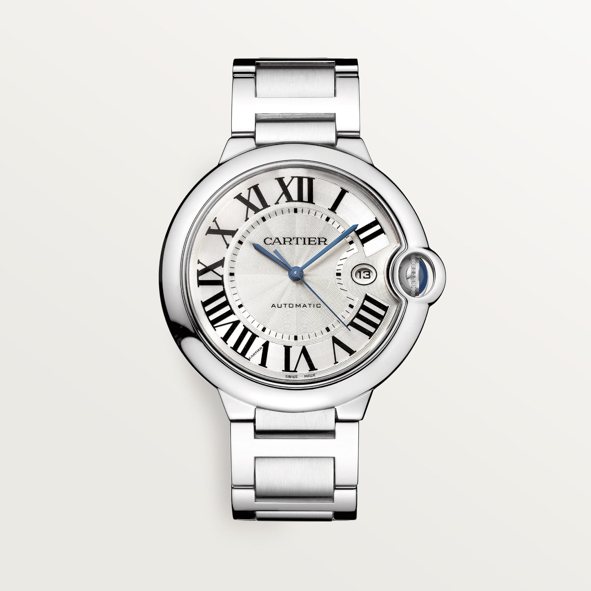 Ballon Bleu de Cartier watch, 42 mm. Mechanical movement with automatic winding, caliber 1847 MC. Steel case, fluted crown set with a cabochon synthetic spinel. Silver guilloché dial. Blued-steel sword-shaped hands. Sapphire crystal. Calendar aperture at 3 o’clock. Steel interchangeable bracelet. Case thickness: 13 mm. Water-resistant up to 3 bar (approx. 30 meters/100 feet).