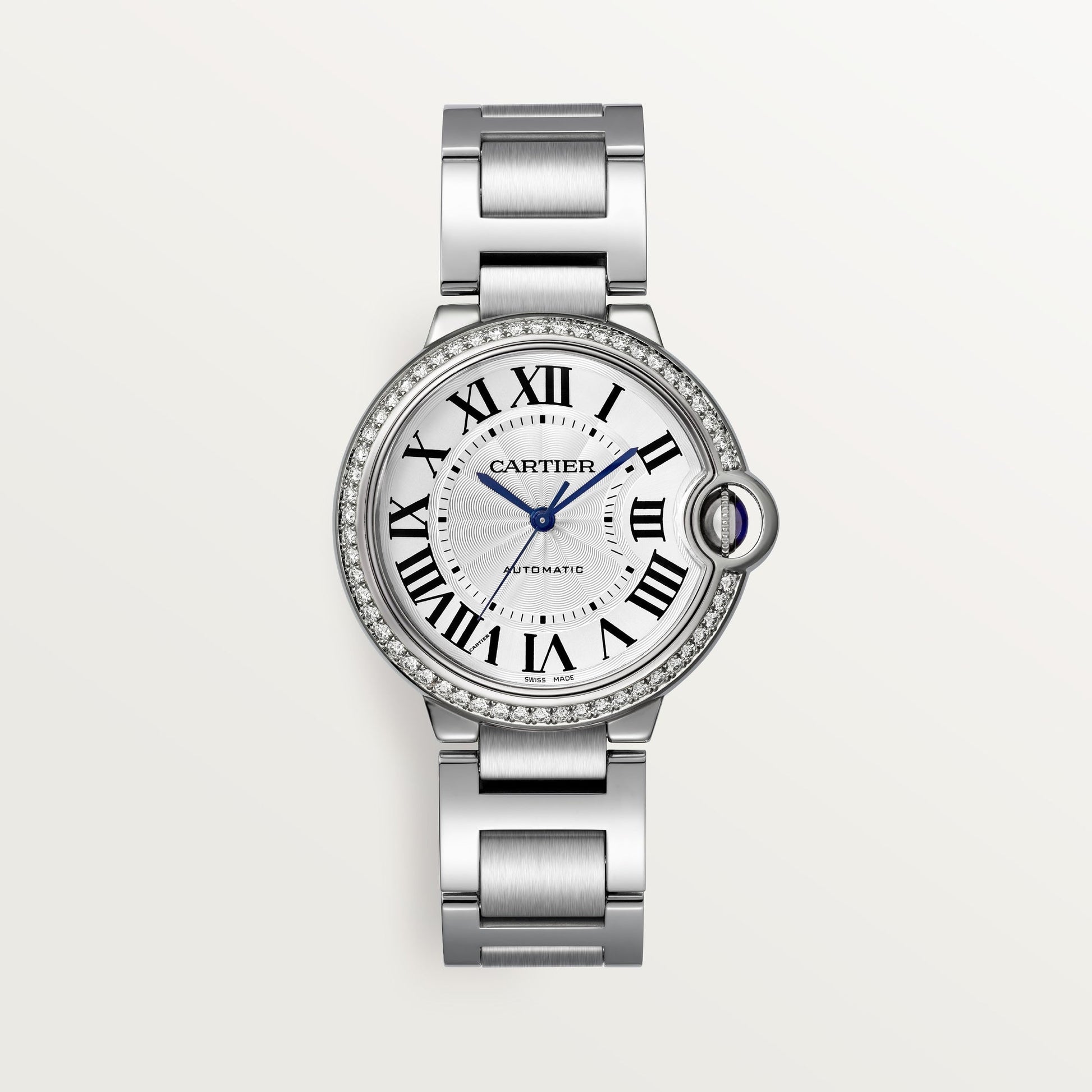 Ballon Bleu de Cartier watch, 36 mm, mechanical movement with automatic winding. Steel case, fluted steel crown set with a cabochon synthetic spinel. Steel bezel set with 54 brilliant-cut diamonds totaling 0.78 carat. Silver guilloché dial. Blued-steel sword-shaped hands. Sapphire crystal. Steel interchangeable bracelet. Case thickness: 12.1 mm. Water-resistant up to 3 bar (approx. 30 meters/100 feet).