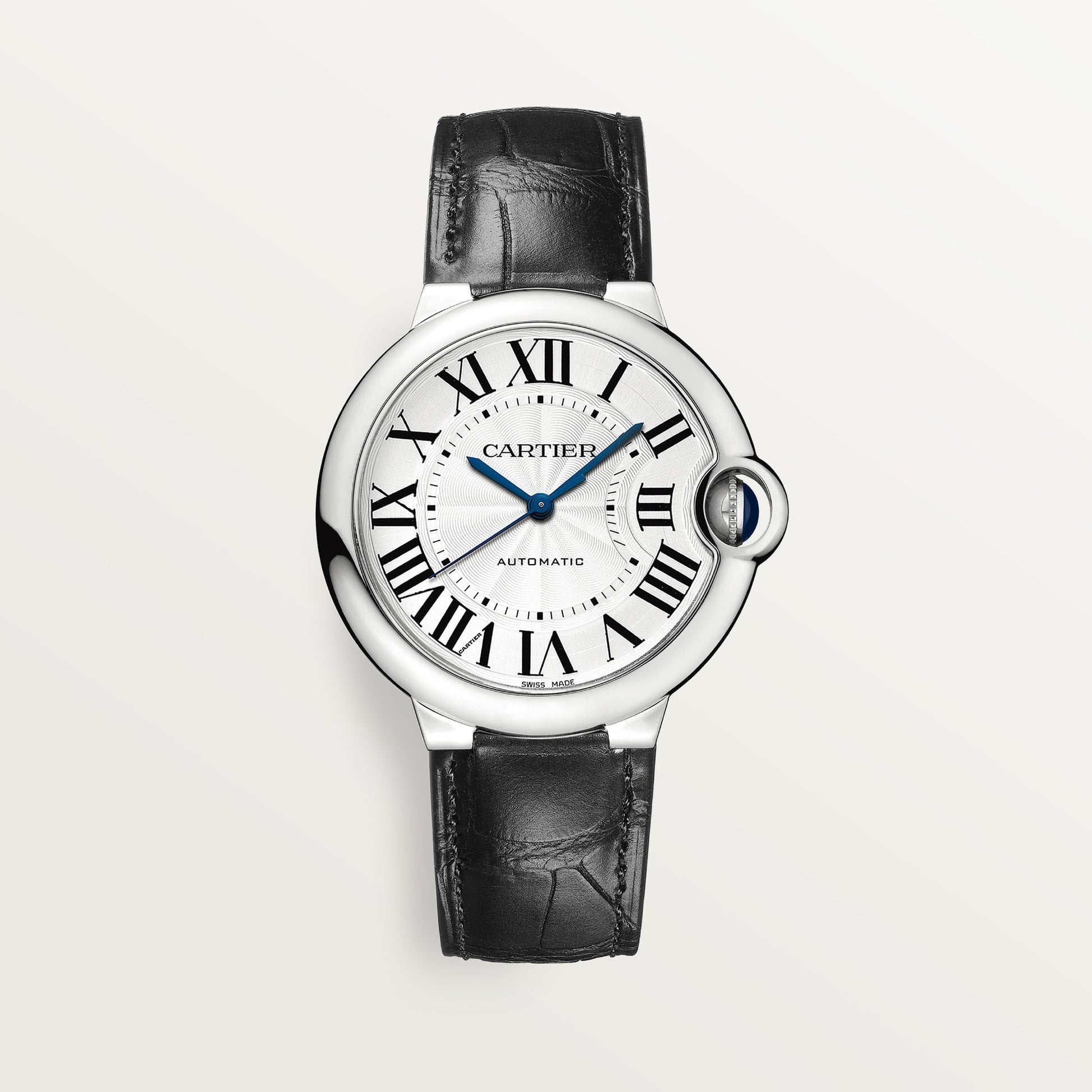 Cartier Ballon Bleu 36 mm Steel Silver Dial Black Leather Strap WSBB0028