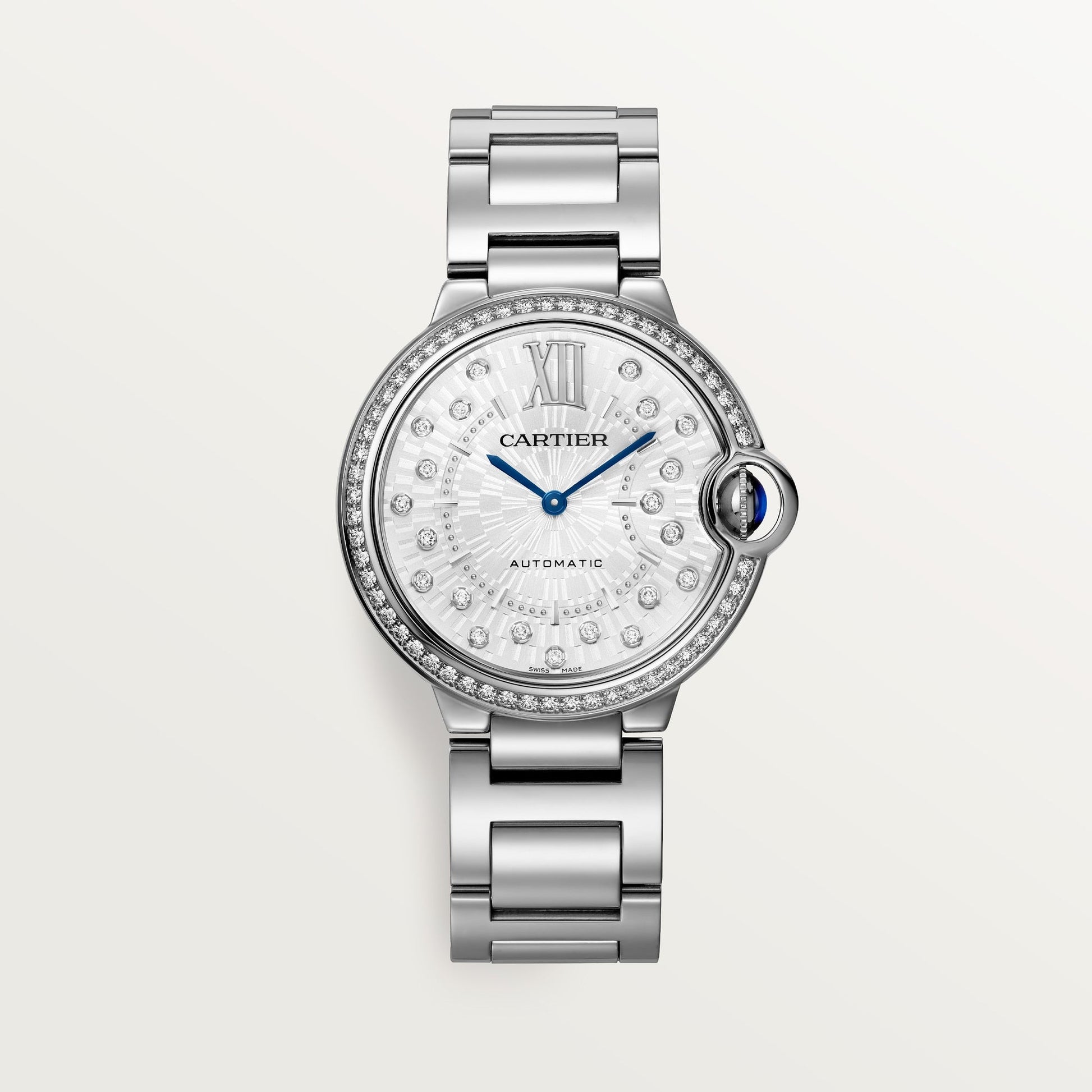 Ballon Bleu de Cartier watch, 36 mm, mechanical movement with automatic winding. Steel case, fluted steel crown set with a synthetic cabochon-shaped spinel. Steel bezel set with 54 diamonds totaling 0.78 carats. Matte silvered sunray-brushed dial set with 21 brilliant-cut diamonds totaling 0.19 carats. Blued-steel sword-shaped hands. Sapphire crystal. Interchangeable steel bracelet. Case diameter: 36 mm, thickness: 12.06 mm. Water-resistant up to 3 bar (approx. 30 meters/100 feet).