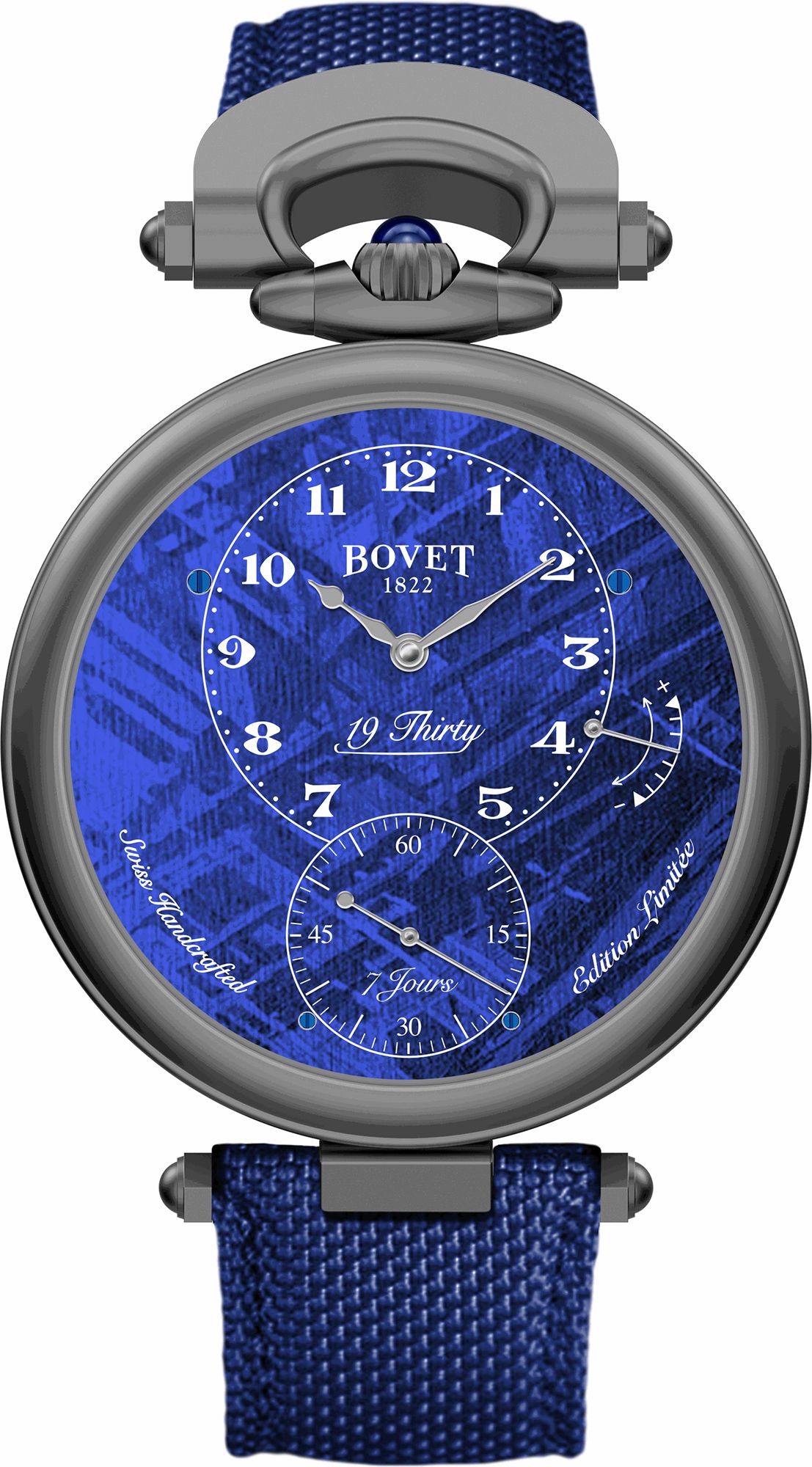 The Bovet 19Thirty "A Slice of Heaven" Blue Meteorite Titanium watch is a stunning homage to the cosm os. Its dial, made from a 4.5-billion-year-old Gibeon meteorite, showcases the distinctive Widmanstätten pattern, carefully etched w ith nitric acid. Enhanced by a unique transparent blue PVD coating, the natural textures shine through brilliantly. Encased in a 42m m sand-blasted grade five titanium case, this watch combines strength with refined style. Each meteorite dial is one-of-a-kind, offe ring a truly personalized timepiece. Powered by a hand-finished movement with a seven-day power reserve, it lets you wear a genuine piece of the universe on your wrist.