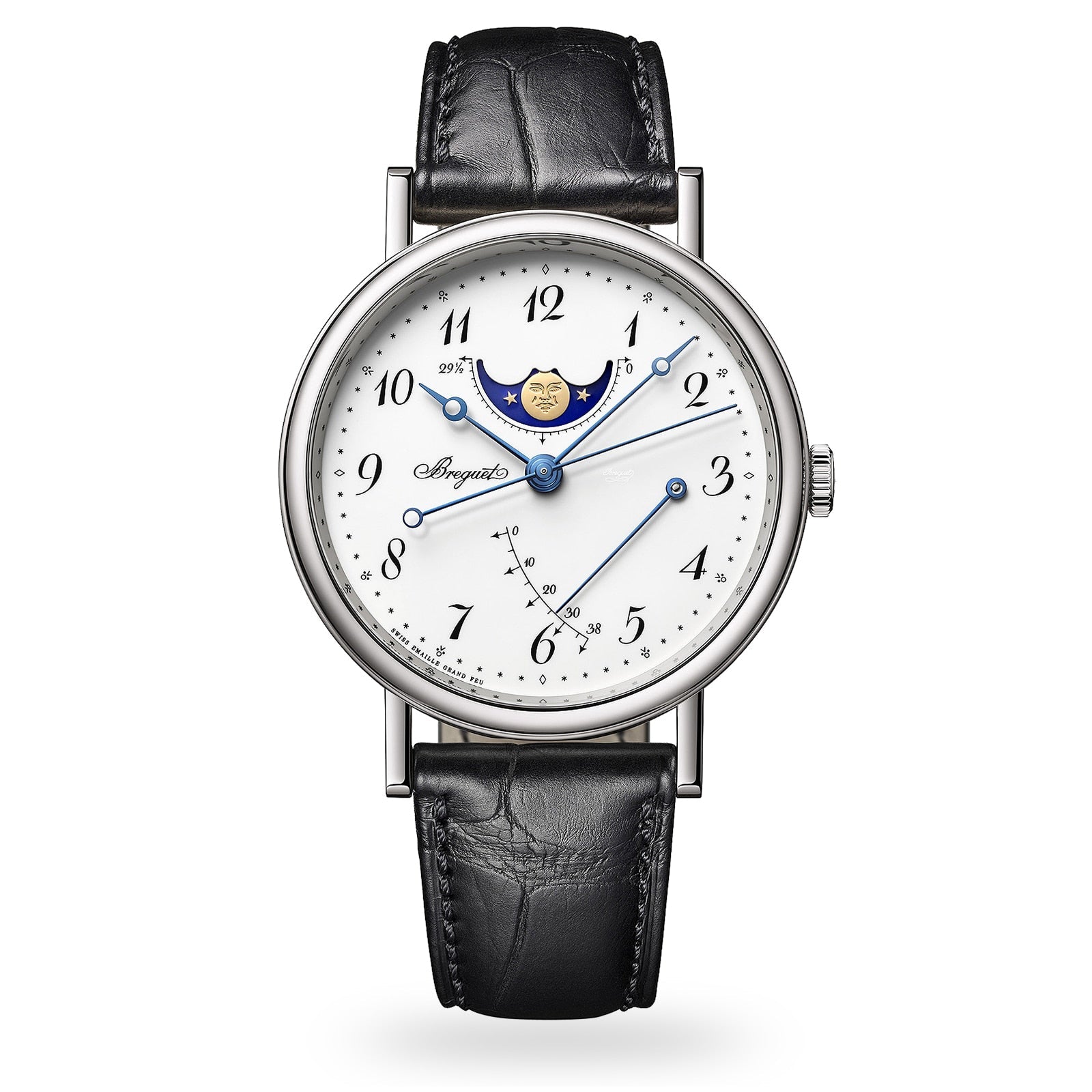 Breguet is one of the oldest surviving Swiss watchmaking brands, famous for pioneering numerous watchmaking technologies, such as the tourbillion mechanism invented by Abraham-Louis Breguet in 1801. Founded in 1775 Breguet stay true to their heritage, producing flawless timepieces with timeless style. The Breguet Classique Moon Phase 7787BB/29/9V6 features a 39mm 18ct white gold case, a calibre 591/DRL movement with a moon phase complication, and a power reserve of 38 hours. Presented on a black leather strap and secured with a pin buckle clasp. Water resistant to 30 meters. Explore the full Breguet collection.