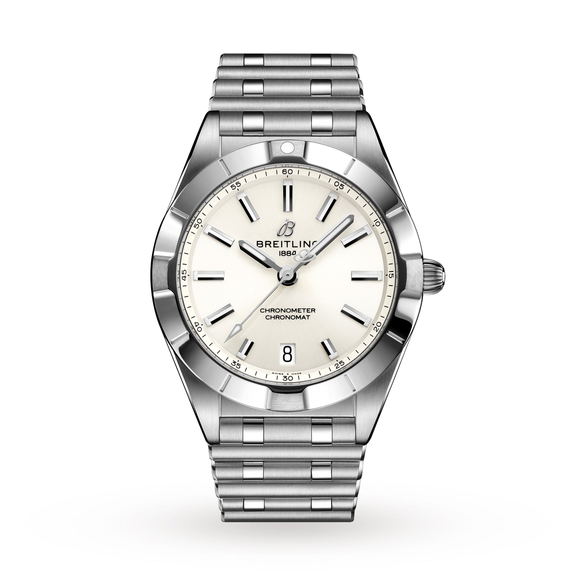 The Chronomat - Inspired by style and elegance Glistening diamond hour markers 32mm stainless steel case with the iconic Rouleaux bracelet Powered by the Breitling 77 calibre movement – a COSC-certified SuperQuartz™ chronometer Water resistant to 10 bar (100 metres) SPORTY YET CHIC Embracing sporty yet chic design elements, the Chronomat collection is inspired by style and elegance. Featuring an array of vibrant dials, straps, and bracelets, all timepieces within the range are certified chronometers recognised by the COSC. This Chronomat Automatic 32 is characterised by the iconic Rouleaux bracelet with its butterfly clasp. REFINED ELEGANCE This refined model boasts a 32mm stainless steel cased teamed with a polished stainless steel bracelet. The silver-tone dial features minimalist silver-tone batons and hour markers, as well as a date display window positioned at 6 o‘clock. The Breitling 77 calibre movement, a COSC-certified SuperQuartz™ chronometer, provides precision and reliability, while water resistance to 10 bar (100 metres) further enhances performance.