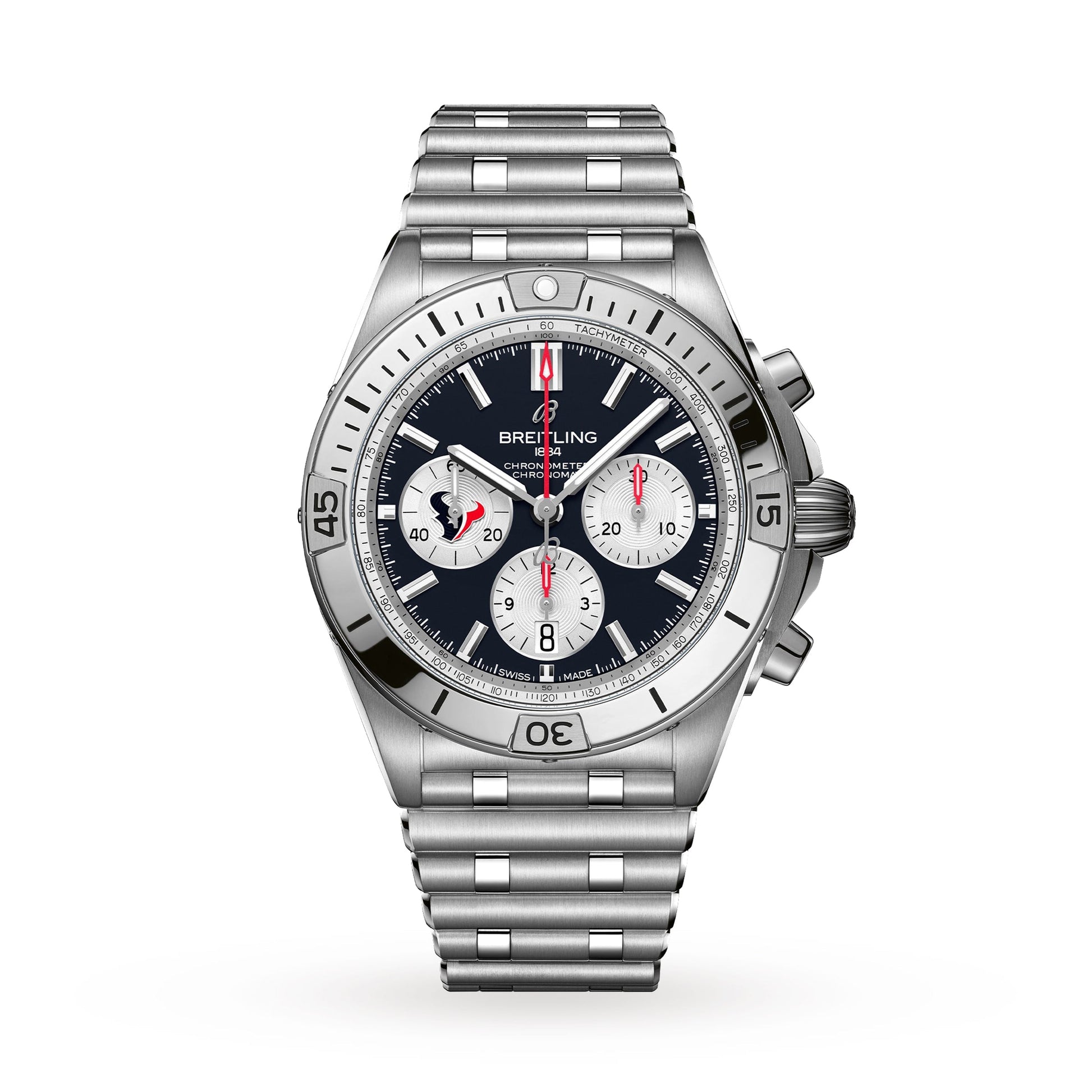 Step up your game with the Breiling Chronomat B01 42 NFL Team Editions. The stainless-steel and rubber strap variations combine high-performance functionality with all-purpose style. With raised rider tabs at the 15-minute marks, an easy-grip onion crown, and a classic rouleaux bracelet, you'll be ready to support your team. Make a statement both on and off the field with a timepiece that embodies the spirit of the game. Celebrate your team with the exclusive Chronomat B01 42 NLF Team Editions. In a match-up as exciting as the Superbowl, Breitling teamed up with the National Football League to create a first-of-its-kind collection that brings together the high-energy world of football with Breitling's timeless craftsmanship. In honour of the NFL's 104th anniversary, each team's watch is limited to 104 pieces, making this collection a true collector's item. Each of the 32 watches features its team's distinctive colours and logos on the dial and the iconic NFL logo on the caseback-designed for the ultimate football fan. Houston Texans watch celebrates this Space City team with its colours captured in its dark navy dial with white sub-dials. The sub- dials at 9 o’clock honours this team with the recognisable Houston Texans logo.