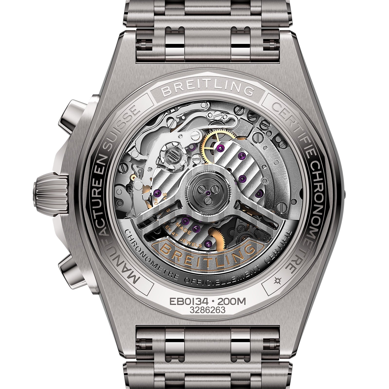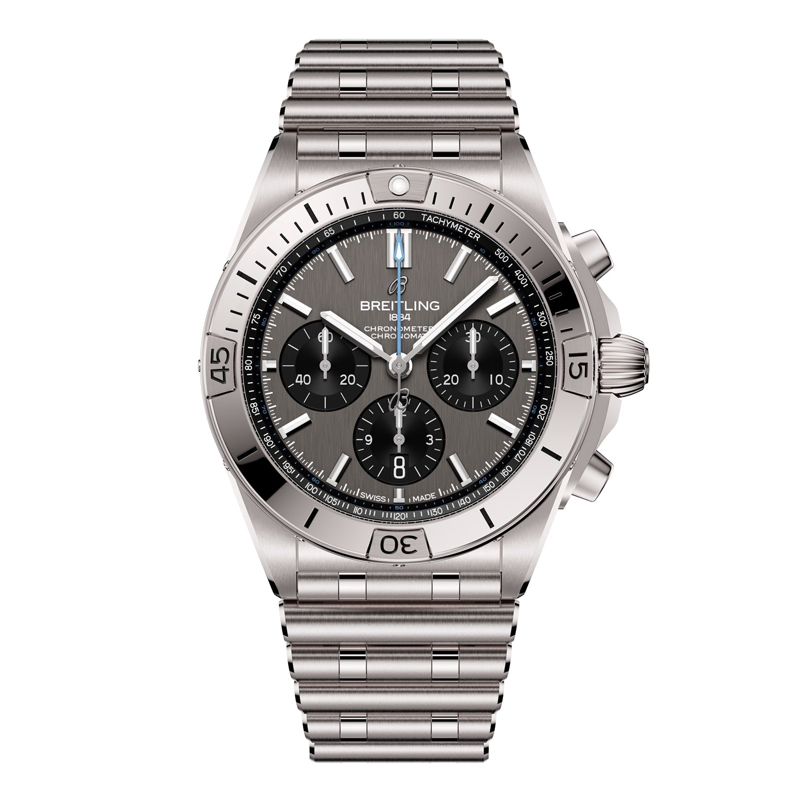 Chronomat - an all-purpose watch for every pursuit Housed in a robust 42mm titanium case Secured with a titanium bracelet Bold grey dial with three black chronograph sub-dials Powered by the Breitling 01 calibre movement with a 70-hour power reserve FOR EVERY PURSUIT An all-purpose watch for every pursuit, the Chronomat was introduced in 1984 to celebrate Breitling's centenary in style. Inspired by the original 1980s Chronomat, created for aerobatic squadrons, the Chronomat B01 features a 42mm case and an instantly recognisable bezel with four rider tabs at the 15-minute marks. Available with a range of colourful dials, the model is equipped with the signature Roleaux bracelet in metal or rubber, and powered by the in-house Breitling manufacture calibre 01 - a COSC- certified chronometer. BOLD AND CONFIDENT This all-purpose sports watch is presented in a 42mm titanium case, with a unidirectional ratcheted rotating bezel and a sapphire crystal case back. Protected by sapphire crystal, the bold grey dial features three chronograph sub-dials - a 1/4th second chronograph, and 30-minute and 12-hour totalisers - as well as a date display and a tachymeter scale to measure speed over a fixed distance. Power and precision are provided courtesy of the Breitling 01 calibre self- winding mechanical movement, complete with a 70-hour power reserve and water resistance to 20 bar (200 metres). A titanium bracelet completes the look.
