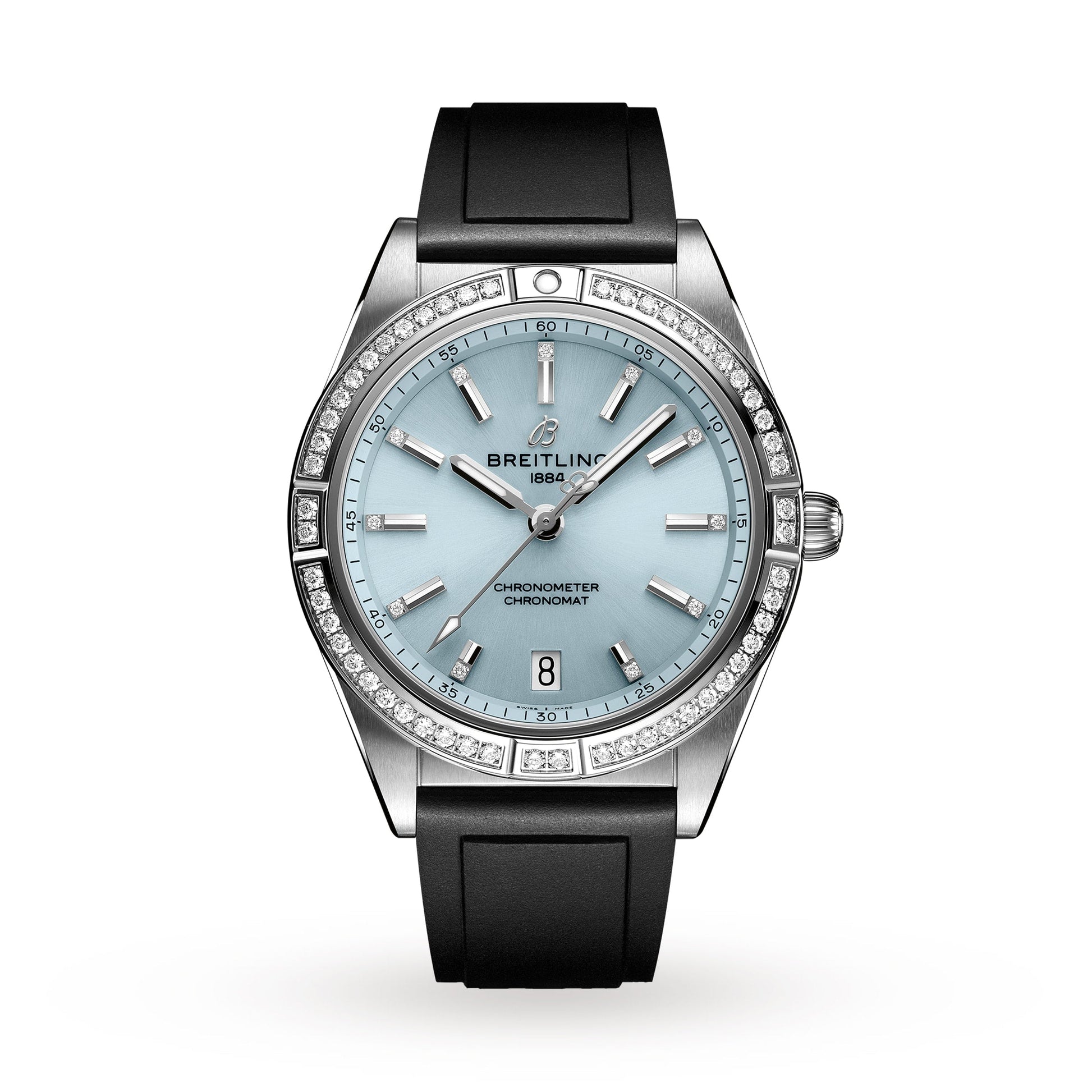 Originally designed in 1984 for the Freece Tricolori military aerobatic display team, the Chronomat range exemplifies the brand's dedication to sport and performance. Specifications Chronomat Automatic 36 Case Size 36 mm Case Material: Stainless Steel Diamond Set Grey Gold Bezel Water resistance 100 m Ice blue dial Black rubber strap Buckle type – Folding Clasp 2 years warranty