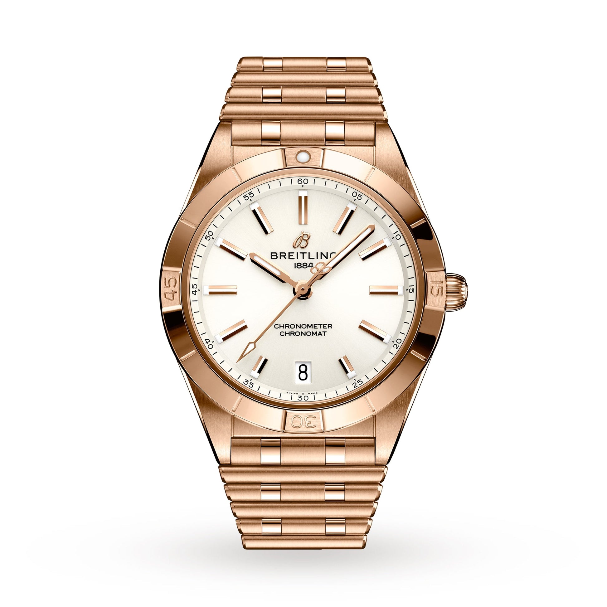 The Chronomat - Inspired by style and elegance Colourful silver-tone dial with red gold details 36mm 18K red gold case with the iconic Rouleaux bracelet Chronometer certified by COSC and powered by Breitling 10 calibre movement 42 hours of power reserve SPORTY YET CHIC Embracing sporty yet chic design elements, the Chronomat collection is inspired by style and elegance. Featuring an array of vibrant dials, straps, and bracelets, all timepieces within the range are certified chronometers recognised by the COSC. This Chronomat Automatic 36 is characterised by the iconic Rouleaux bracelet with its butterfly clasp. STYLISH ELEGANCE This 36mm Chronomat model boasts an elegant, silver-tone dial with red gold hands and indexes, and a date window at six o’clock. The 18K red gold case is presented on a co-ordinating bracelet for an extra touch of refinement, while power is provided by the Breitling 10 calibre movement, certified by COSC.