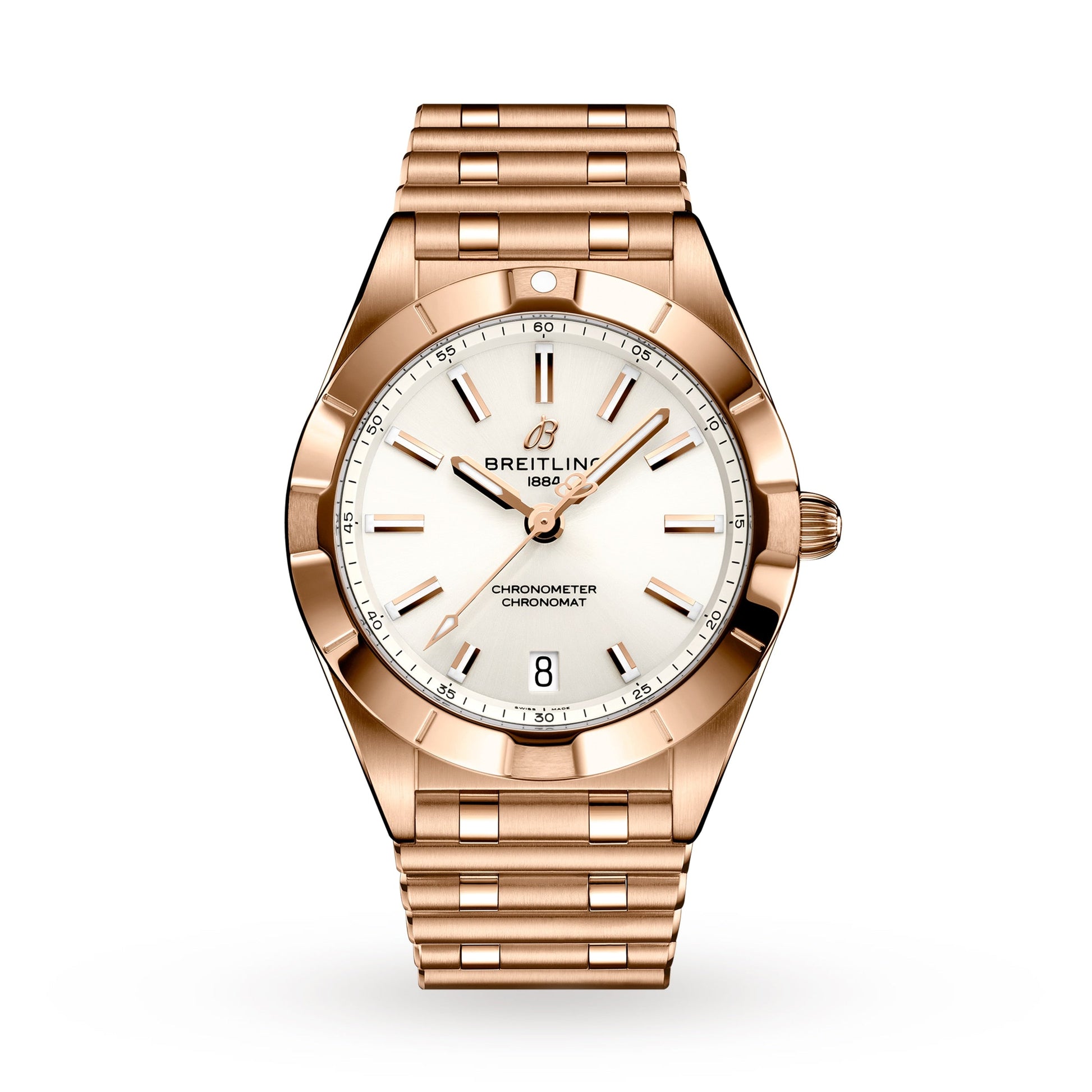The Breitling Chronomat 32mm puts an elegant and feminine twist on the classic sports watch. The Chronomat has a notable role in Breitling’s history, introduced in 1984 during a time where extra-thin quartz timepieces were the norm. The demure clock face is presented on a striking and uncluttered silver dial, featuring minimalist rose gold batons as watch markers. Keeping with the sleek and sophisticated aesthetic is the date window, shown at 6 o’clock on the dial. This stunning timepiece boasts water resistance up to 100 metres, proving fashion and function go hand in hand. Encasing this beautiful timepiece is a timeless rose gold case and rouleaux strap, fastened with a butterfly folding clasp, providing a look that is suitable for every occasion.