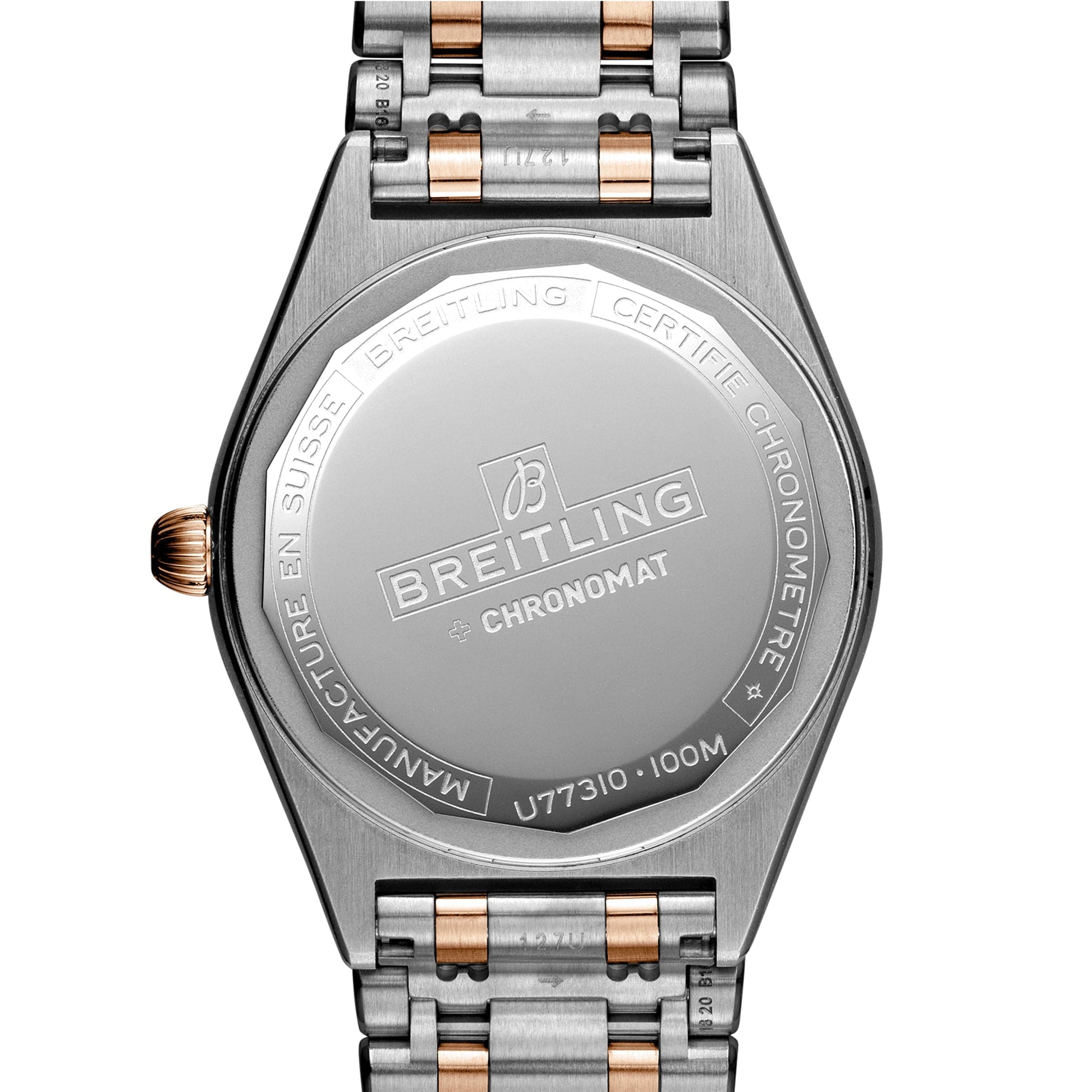 The Chronomat - Inspired by style and elegance Modern-retro inspired design elements 32mm stainless steel and 18K red gold case with the iconic Rouleaux bracelet Powered by the Breitling 77 calibre movement – a COSC-certified SuperQuartz™ chronometer Water resistant to 10 bar (100 metres) SPORTY YET CHIC Embracing sporty yet chic design elements, the Chronomat collection is inspired by style and elegance. Featuring an array of vibrant dials, straps, and bracelets, all timepieces within the range are certified chronometers recognised by the COSC. This Chronomat Automatic 32 is characterised by the iconic Rouleaux bracelet with its butterfly clasp. A DAZZLING DESIGN This 32mm Chronomat model showcases a cool stainless steel and luxurious 18K red gold case presented on a co-ordinating two-tone bracelet. The silver toned dial presents red gold hands and indexes, and a date window at six o’clock, all framed by a red gold bezel. Breitling 77 calibre movement drives this timepiece with certification from the COSC.