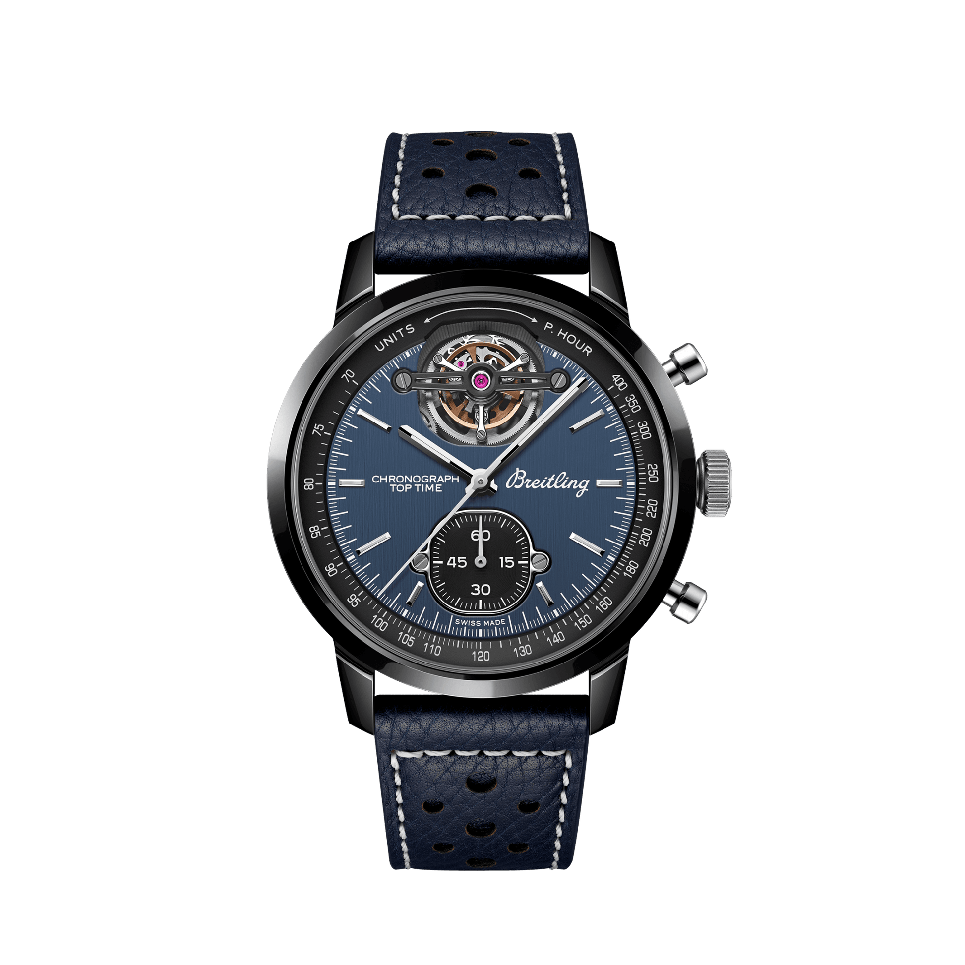 Unworn watch the Breitling Top Time B21 Shelby Cobra, Ceramic, 44mm, Ref# SB21251A1C1X1: a statement of sophistication and precision engineering. Crafted with the utmost attention to detail, this timepiece combines classic design elements with modern functionality to create a truly timeless accessory. With its sleek black ceramic case and exquisite Blue dial, the watch is reminiscent of the steering wheel of a classic car. The contrasting polished silver hour and minute hands and hour markers glow and provide excellent legibility even in poor lighting conditions. They are harmoniously complemented by an elegant central second’s hand. A chronograph with a column wheel and a tourbillon, first used in the Top Time collection, adds a touch of sportiness. The rotating tourbillon, located at 12 o'clock, holds important parts such as the balance wheel, spring and escapement in a rotating cage. The brutal black sub-dial is attached with large screws at the 6 o'clock position, maintaining the overall aesthetics of the model. A tachymeter scale on the black outer edge of the dial also supports her. The watch is adjusted using a screwless titanium crown with two spacers and titanium chronograph pushers. On the crown printed Logo Breitling. The dial closed by a Scratch resistant sapphire crystal. The transparent sapphire crystal case back reveals the mesmerizing operation of the movement. Adds visual interest without overwhelming the design and black ceramic fixed bezel. The Watch comes with Breitling B21 (Manufacture La Joux-Perret) automatic chronograph movement, contains 30 jewels, and has an approximate power reserve of 55 hours. The watch presented on a Blue calfskin leather strap with Titanium Folding clasp. The water resistance is up to 100m/330ft.