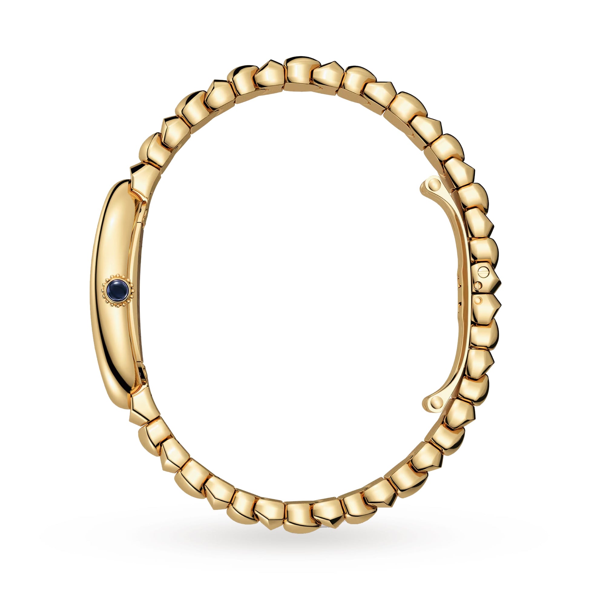 Baignoire de Cartier watch, small model, quartz movement. 18K yellow gold (750/1000) case and beaded crown. Silvered dial, blued- steel sword-shaped hands, sapphire crystal. 18K yellow gold (750/1000) bracelet. Length: 31.4 mm, width: 23.09 mm, thickness: 6.95 mm. Water-resistant up to 3 bar (approx. 30 meters).