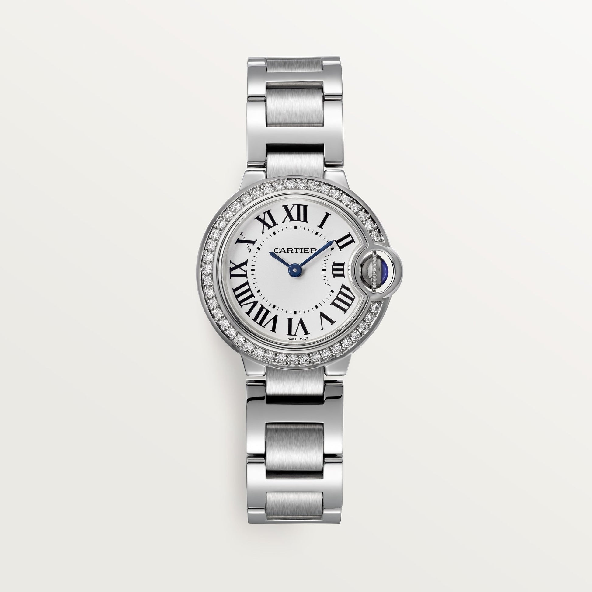 Ballon Bleu de Cartier watch, 28 mm, quartz movement. Steel case, fluted steel crown set with a synthetic cabochon-shaped spinel. Steel bezel set with 42 diamonds totaling 0.48 carats. Opaline dial. Blued-steel sword-shaped hands. Sapphire crystal. Interchangeable steel bracelet, wrist size 6.5”. Thickness: 0.35”. Water-resistant to 3 bar (approx. 30 meters/100 feet).