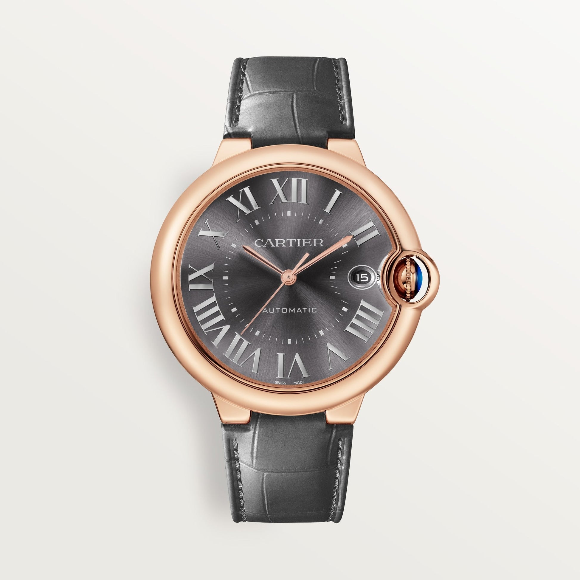 Ballon Bleu de Cartier watch, 40 mm, Manufacture mechanical movement with automatic winding, caliber 1847 MC. 18K rose gold (750/1000) case, fluted crown set with a sapphire cabochon, dark gray sunray-brushed dial, 18K rose gold (750/1000) sword-shaped hands, sapphire crystal, interchangeable gray leather strap, interchangeable 18K rose gold (750/1000) deployant buckle, calendar aperture at 3 o’clock. Thickness: 12.4 mm. Water-resistant up to 3 bar (approx. 30 meters/100 feet).