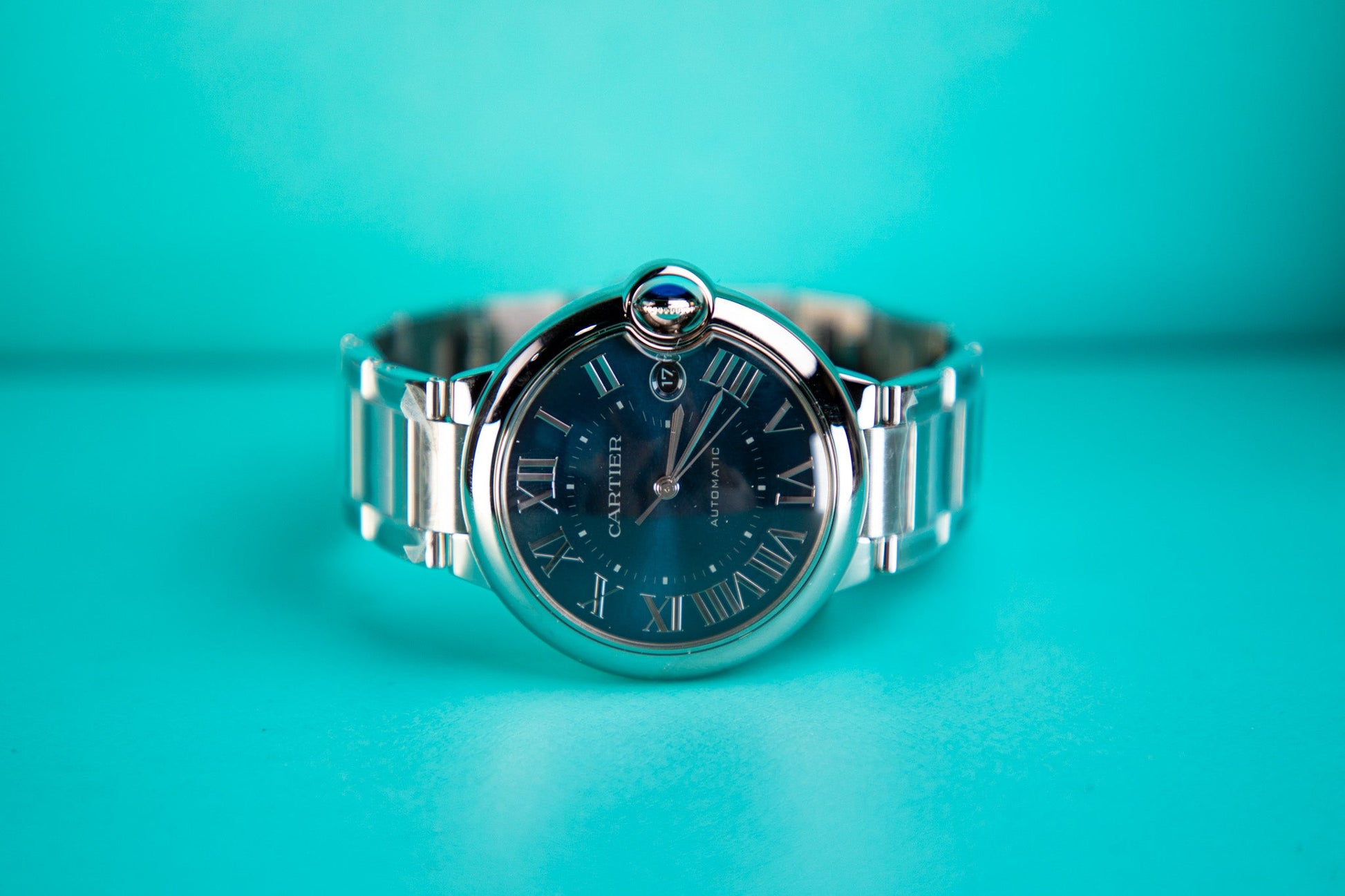 Ballon Bleu de Cartier watch, 40 mm, Manufacture mechanical movement with automatic winding, caliber 1847 MC. Steel case, fluted crown set with a synthetic cabochon-shaped spinel, blue sunray-brushed dial, silvered sword-shaped hands, sapphire crystal, interchangeable steel bracelet, calendar aperture at 3 o'clock. Thickness: 12.4 mm. Water-resistant up to 3 bar (approx. 30 meters/100 feet).