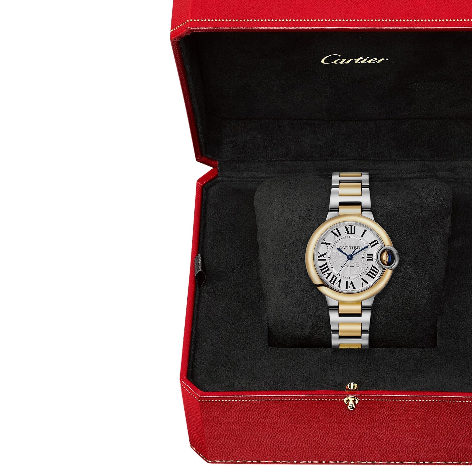 Ballon Bleu de Cartier - constantly seeking harmony Merging elegant lines with volumetric grace Housed in a 33mm case crafted from 18K yellow gold and steel Silvered guilloche dial with blued-steel sword-shaped hands Powered by mechanical movement with automatic winding ROUNDNESS REIMAGINED An unmistakeable Cartier collection, the Balloon Bleu de Cartier represents a quest for balance. Redefining circular form, its double-curved design achieves a beautiful interplay of shape and dimension. Each watch in the collection features a blue sapphire cabochon nestled within the seamlessly integrated winding crown, giving the appearance of a floating blue balloon. The crown is protected by a sleek metal arch at the three o'clock position, shielding the rich blue gem. ELEGANCE AND STRENGTH This 33mm timepiece features a sophisticated combination of 18K yellow gold and durable steel in both its case and bracelet, creating a striking contrast that exudes elegance and strength. Crafted in a meticulous 15 stage process, the silvered dial features an intricate guilloche finish, Roman numerals and the blued-steel sword-shaped hands that have become characteristic of the collection. A reliable self-winding mechanical movement with a 37-hour power reserve ensures flawless performance.