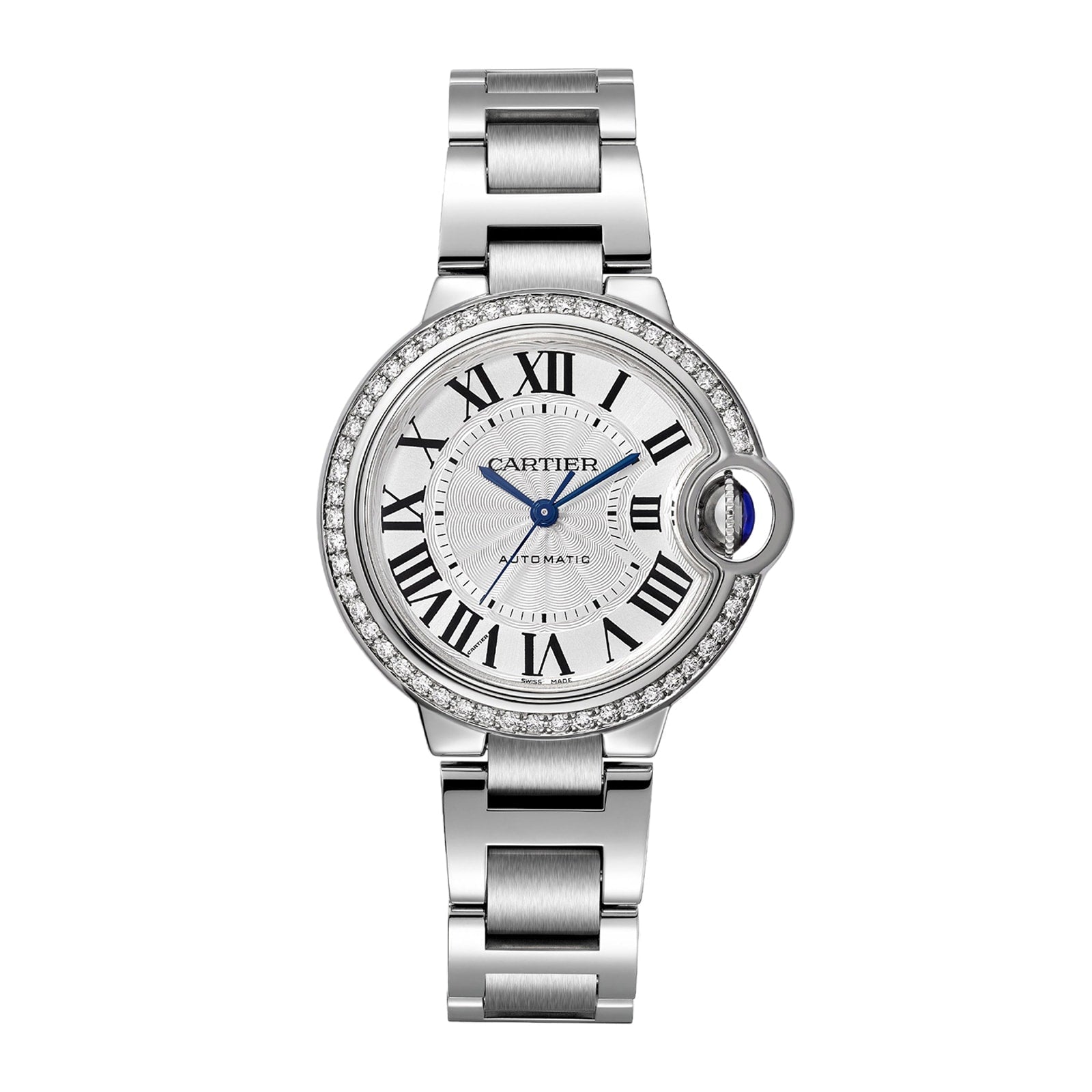 PRODUCT DESCRIPTION Ballon Bleu de Cartier watch, 33 mm, mechanical movement with automatic winding. Steel case, steel fluted crown set with a cabochon synthetic spinel. Steel bezel set with 50 brilliant-cut diamonds totaling 0.58 carat. Silver guilloché dial. Blued-steel sword-shaped hands. Sapphire crystal. Steel interchangeable bracelet. Thickness: 9.96 mm. Water-resistant up to 3 bar (approx. 30 meters/100 feet). ABOUT THE COLLECTION Floating like a balloon and as blue as the cabochon safely nestled in its side, the Ballon Bleu watch by Cartier adds a dash of elegance to male and female wrists alike. Roman numerals are guided on their path by a deep blue winding mechanism. With the convex curves of the case, guilloché dial, sword-shaped hands, and polished or satin- finish links of the bracelet...the Ballon Bleu watch by Cartier floats through the world of Cartier watchmaking.