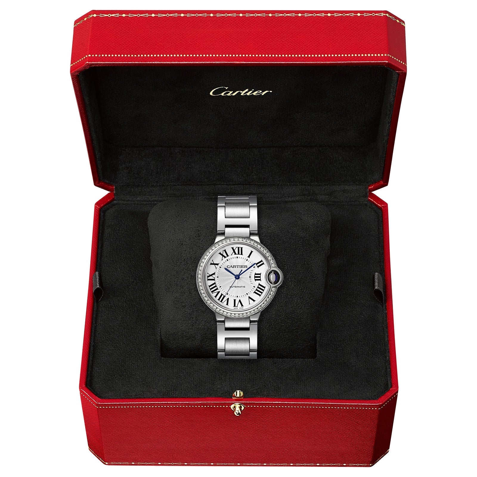 Ballon Bleu de Cartier watch, 36 mm, mechanical movement with automatic winding. Steel case, fluted steel crown set with a cabochon synthetic spinel. Steel bezel set with 54 brilliant-cut diamonds totaling 0.79 carat. Silver guilloch dial. Blued-steel sword- shaped hands. Sapphire crystal. Steel interchangeable bracelet. Case thickness: 12.1 mm. Water-resistant up to 3 bar (approx. 30 meters/100 feet).