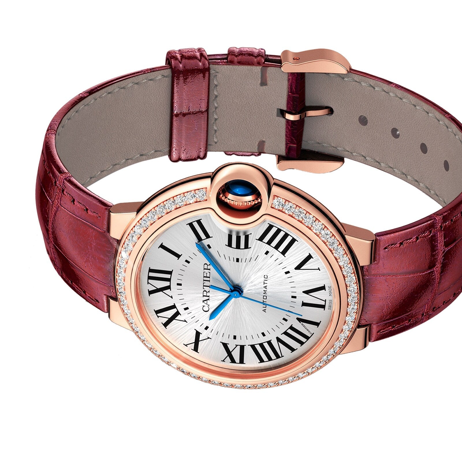 Floating like a balloon and as blue as the cabochon safely nestled in its side, the Ballon Bleu watch by Cartier adds a dash of elegance to male and female wrists alike. Roman numerals are guided on their path by a deep blue winding mechanism.