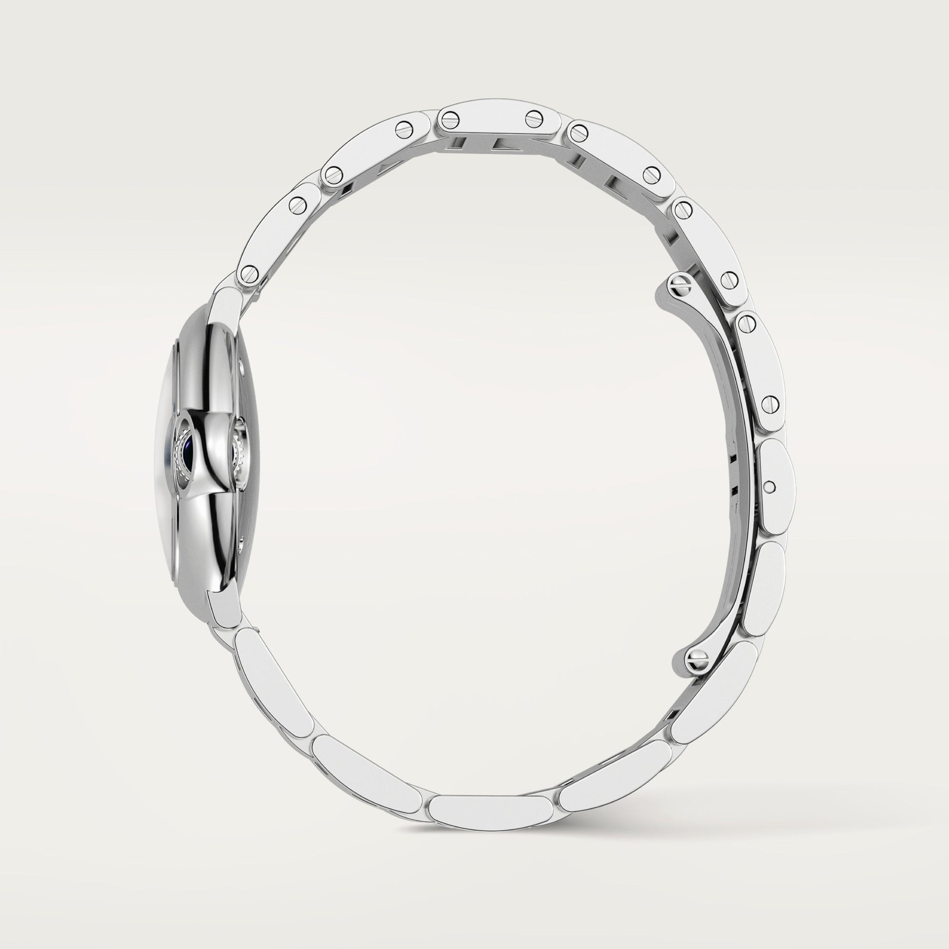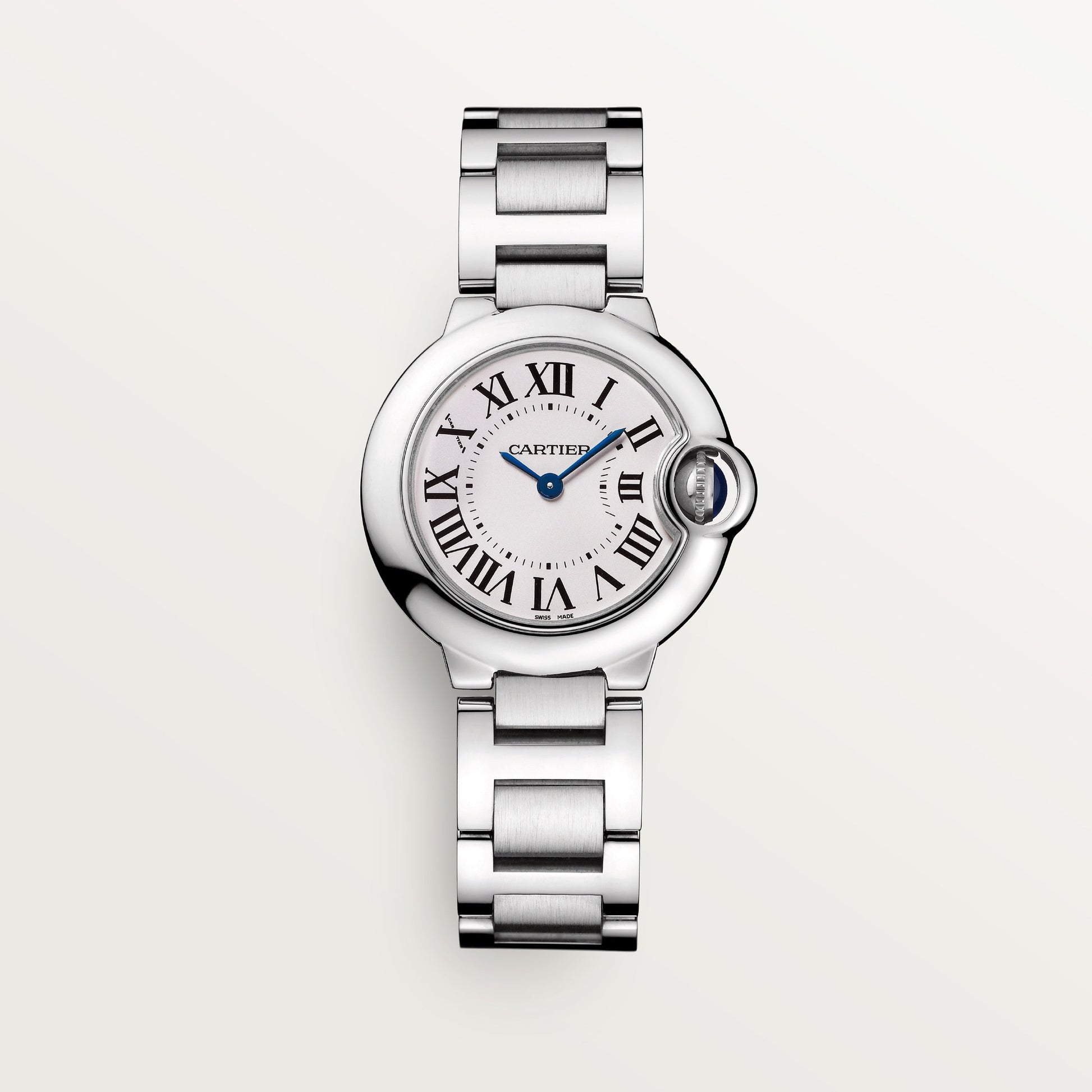 The Ballon Bleu de Cartier watch has a 28 mm quartz movement and features a steel case with a fluted crown set with a synth etic cabochon-shaped spinel. The silvered opaline dial showcases Roman numerals and blued-steel sword-shaped hands, all protected by a sapphire crystal. This watch also comes with an interchangeable steel bracelet. With a case diameter of 28.6 mm and a thickness of 9.35 mm, it is water-resistant up to 30 meters.