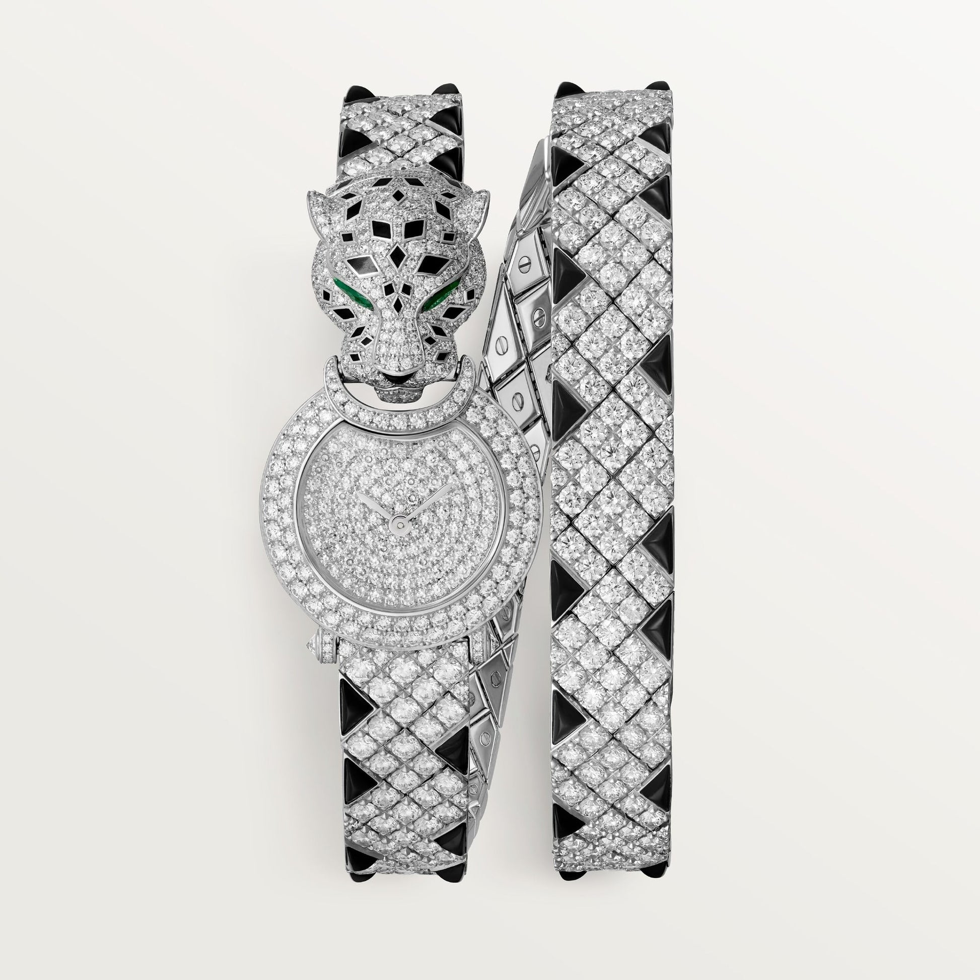La Panthère watch, 23.6 mm, quartz movement. Rhodiumized white gold 750/1000 case set with 136 brilliant-cut diamonds totaling 1.04 carats, rhodiumized white gold 750/1000 panther head set with 297 brilliant-cut diamonds totaling 1.43 carats, pear-shaped emerald eyes totaling 0.15 carat, black lacquer spots and nose, rhodiumized white gold 750/1000 dial set with 117 diamonds totaling 0.54 carat, rhodiumized steel sword-shaped hands, rhodiumized white gold 750/1000 bracelet set with 464 brilliant-cut diamonds totaling 17.81 carats and 52 black pyramid-shaped spinels, rhodiumized white gold 750/1000 ardillon buckle set with 22 brilliant-cut diamonds totaling 0.36 carat. Thickness: 7.8 mm. Water-resistant up to 3 bar (approx. 30 meters/100 feet).
