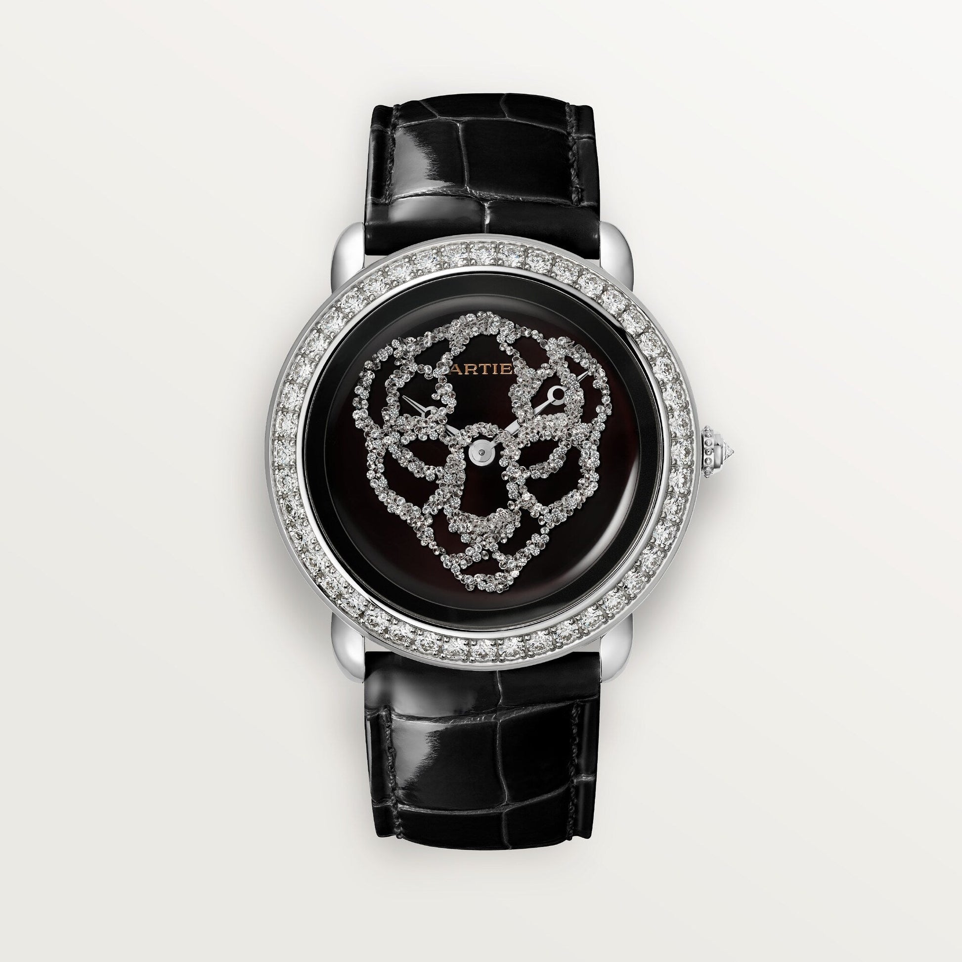 Révélation d'une Panthère watch, 37 mm, mechanical movement with manual winding, caliber 430 MC. Rhodiumized 18K white gold (750/1000) case set with 44 brilliant-cut diamonds totaling 1.64 carats, black lacquer dial, panther décor made of 650 brilliant-cut diamonds totaling 0.93 carat revealed by the movements of the wrist, beaded crown set with a brilliant-cut diamond, rhodiumized steel apple-shaped hands, shiny black leather strap, rhodiumized 18K white gold (750/1000) deployant buckle set with 43 brilliant-cut diamonds totaling 0.42 carat. Thickness: 8.6 mm. Water-resistant up to 3 bar (approx. 30 meters/100 feet).