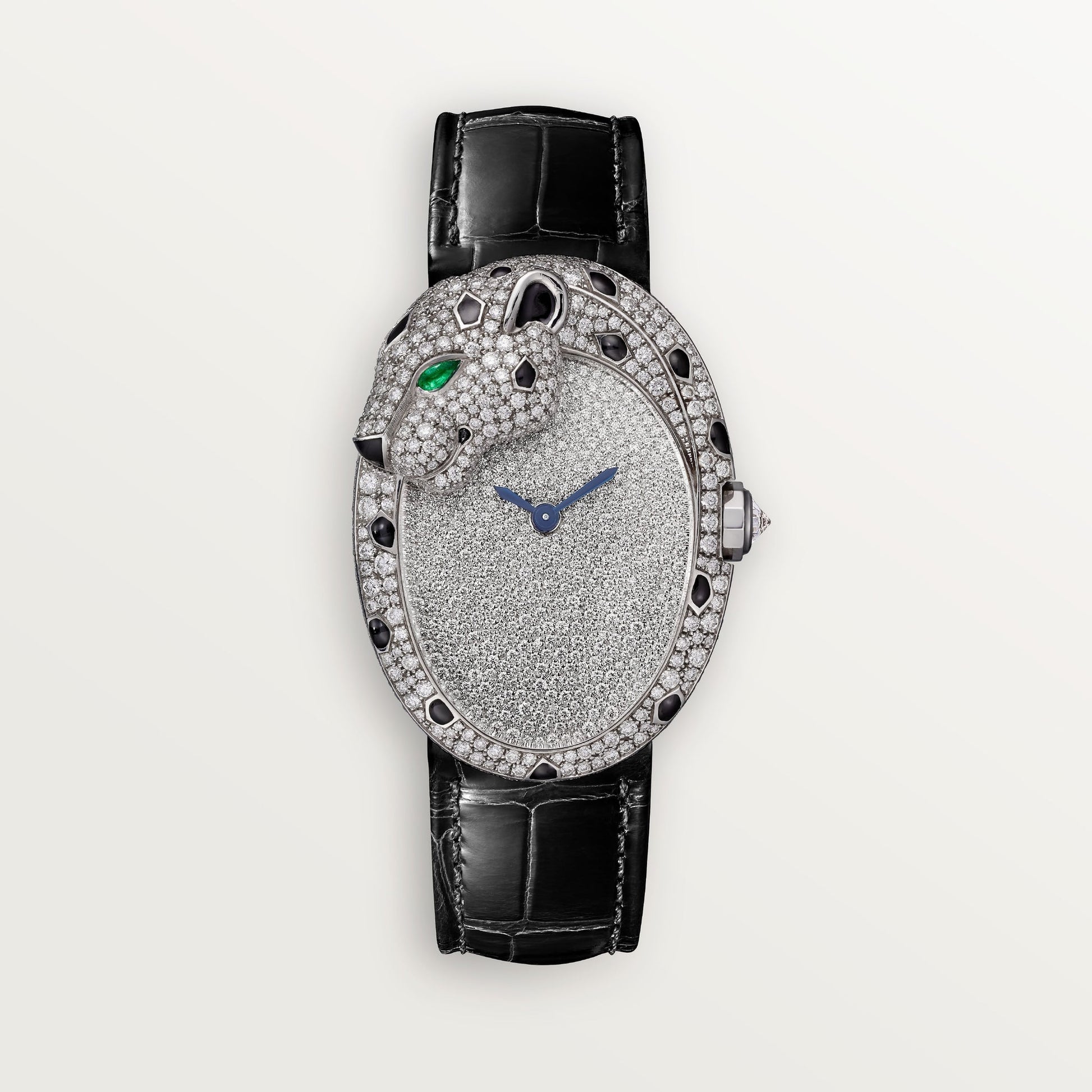 Panthère Lovée watch, mechanical movement with automatic winding, caliber 530 MC. Rhodiumized white gold 750/1000 case set with 438 brilliant-cut diamonds totaling 1.78 carats, black lacquer spots, pear-shaped emerald eye, diamond-set shagreen dial (499 brilliant-cut diamonds totaling 1.19 carats), crown set with 1 brilliant-cut diamond totaling 0.20 carats, blued-steel sword-shaped hands, shiny black leather strap (additional strap in shiny dark green leather), rhodiumized white gold 750/1000 ardillon buckle set with 21 brilliant-cut diamonds totaling 0.20 carats. Water-resistant up to 3 bar (approx. 30 meters/100 feet).