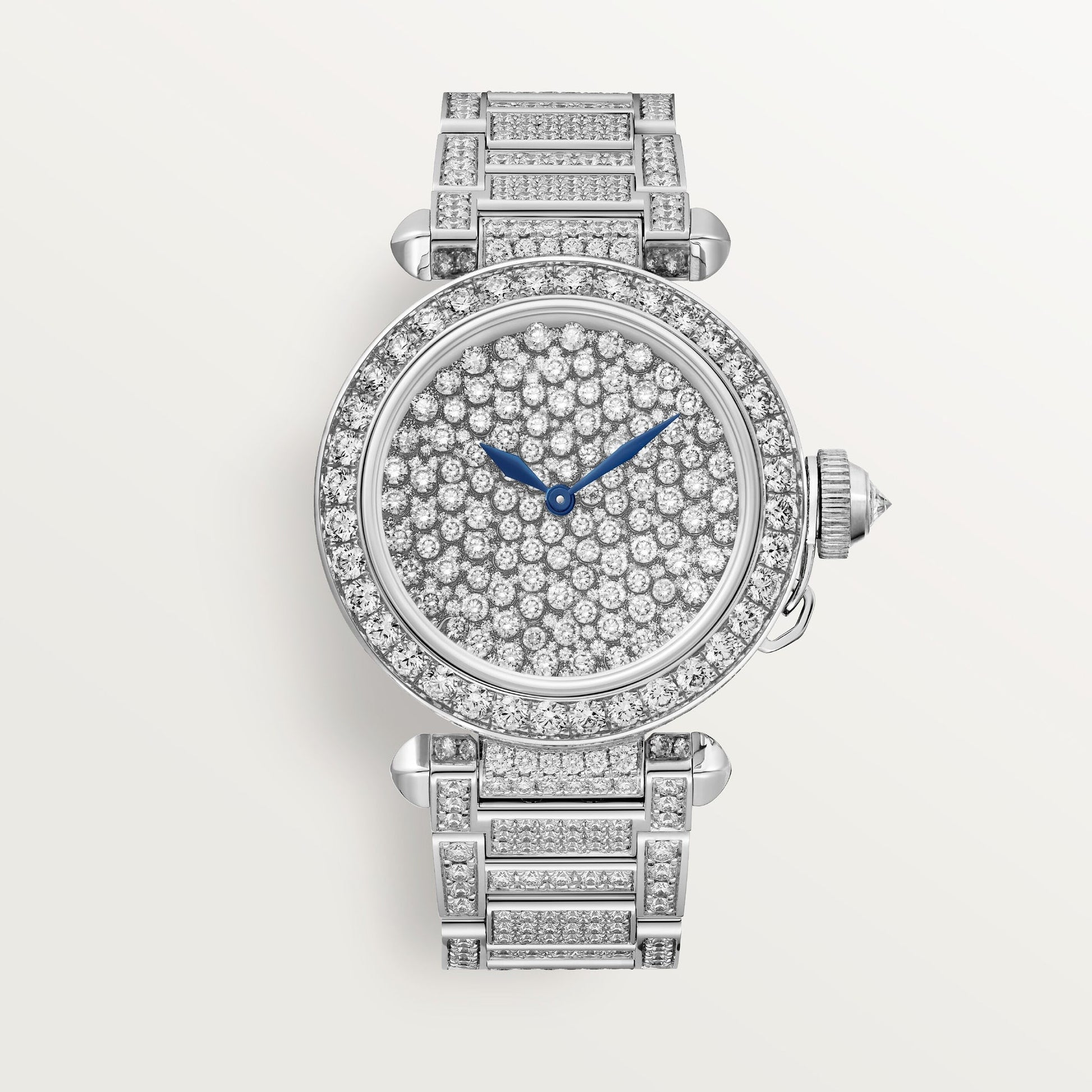 Pasha de Cartier watch, 35 mm, mechanical movement with automatic winding, caliber 530 MC. Rhodiumized white gold 750/1000 case and bezel set with 228 brilliant-cut diamonds totaling 3.60 carats, rhodiumized white gold 750/1000 dial set with 318 brilliant-cut diamonds totaling 3.10 carats, rhodiumized white gold 750/1000 crown protector and fluted crown set respectively with a 0.27-carat brilliant cut diamond and a sapphire, blued-steel diamond-shaped hands, rhodiumized white gold 750/1000 set with 353 brilliant cut diamonds totaling 5.88 carats. Thickness: 9.9 mm. Water-resistant up to 3 bar (approx. 30 meters/100 feet). Numbered limited edition of 100 pieces.