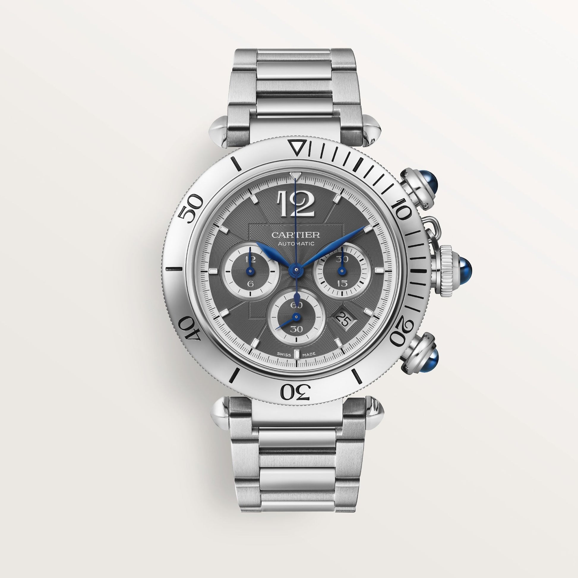 Pasha de Cartier watch, 41 mm, chronograph mechanical movement with automatic winding, caliber 1904-CH MC. Steel case, fluted crown protector, crown and push-pieces set with synthetic spinels, anthracite flinqué dial, blued-steel diamond-shaped hands, steel strap with "SmartLink" adjustment system, second strap in dark gray leather, interchangeable steel deployant buckle. Both are fitted with the "QuickSwitch" interchangeability system. Case diameter: 41 mm, thickness: 11.97 mm. Water-resistant up to 10 bar (approx. 100 meters/330 feet).