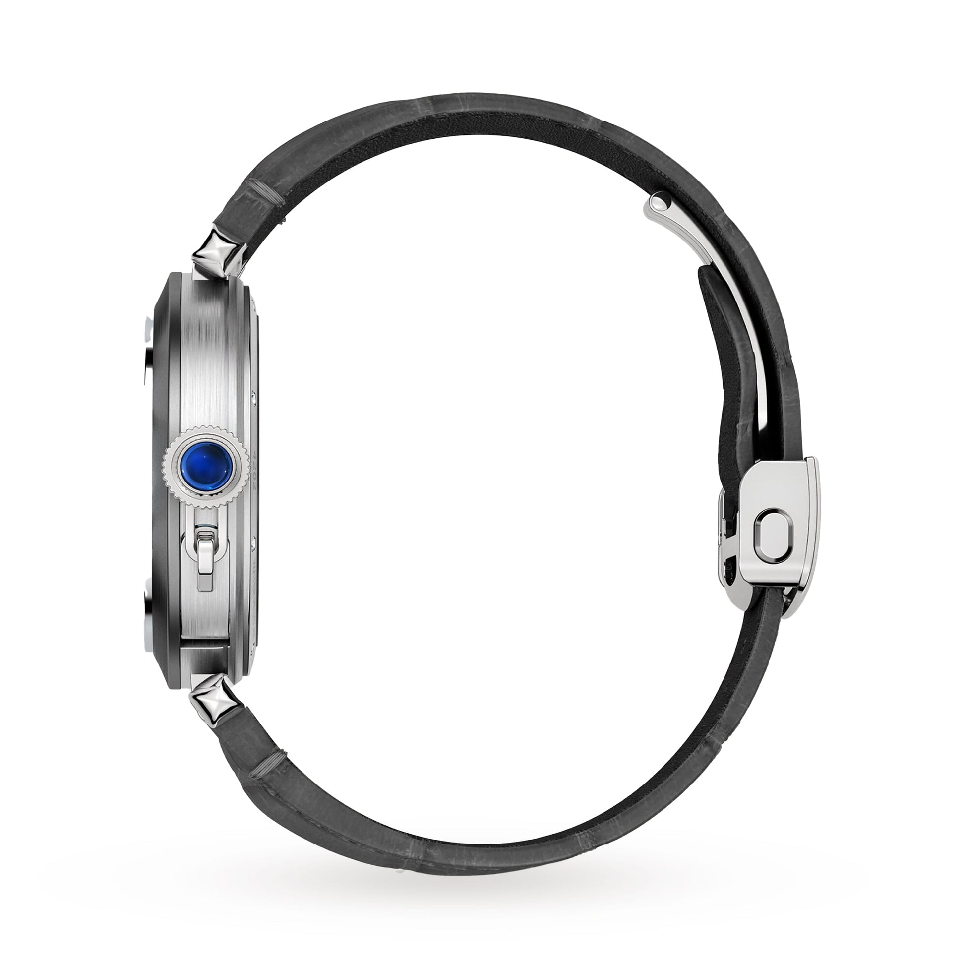 Pasha de Cartier watch, skeleton, mechanical movement with automatic winding, calibre 9624 MC. Case in black ADLC steel, fluted crown cap and crown set with sapphires. Hours and minutes with skeletonised bridges forming Arabic numerals, with luminescent material. Gray steel diamond-shaped hands with luminescent material. Two straps in black and dark grey alligator skin with QuickSwitch interchangeability system, steel folding buckle. Movement consisting of 172 parts including 28 rubies. Movement diameter: 31.05 mm, movement thickness: 5.66 mm, balance: 28,800 vibrations/hour, power reserve approx. 48 hours. Case diameter: 41 mm, thickness: 10.45 mm. Water-resistant up to 3 bar (approx. 30 metres).