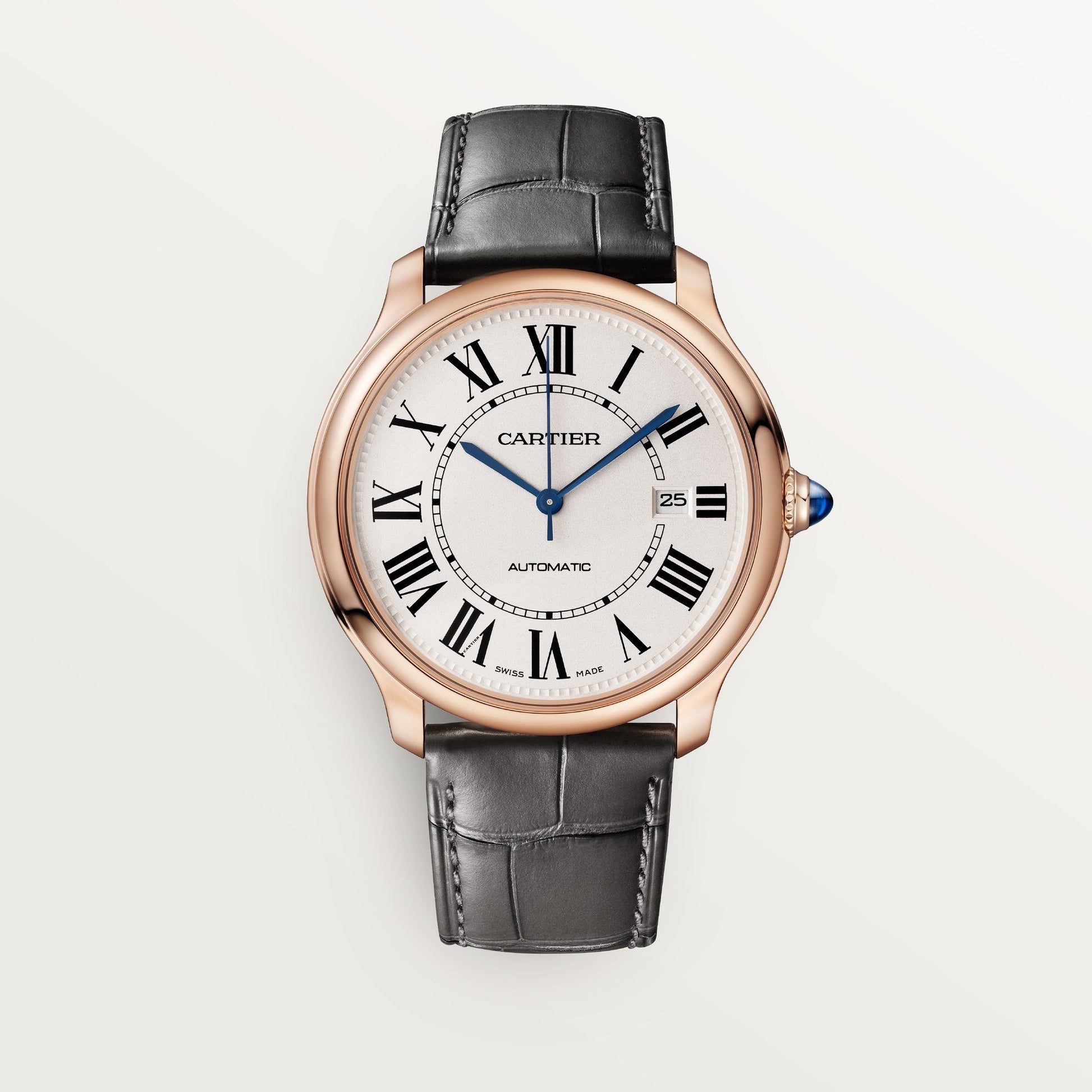Ronde Louis Cartier watch, 40 mm, Manufacture mechanical movement with automatic winding, calibre 1847 MC. Case and beaded crown in 18K rose gold (750/1000) set with a blue sapphire. Sandblasted beige dial. Blued-steel sword-shaped hands. Sapphire crystal. Strap in semi-matte gray leather, deployant buckle in 18K rose gold (750/1000). Thickness: 9.62 mm. Power reserve: 40 hours. Water-resistant up to 3 bar (approx. 30 meters/100 feet).