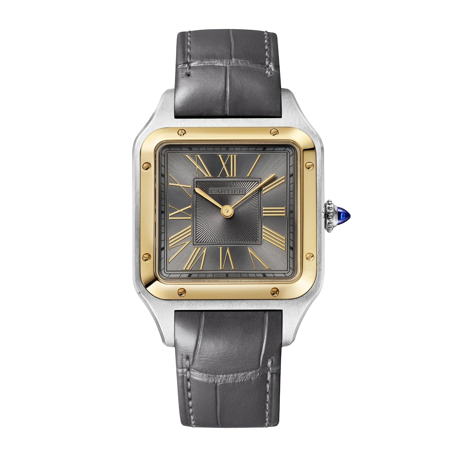 Santos Dumont - an eye for detail Paying tribute to aviation pioneer Alberto Santos-Dumont Housed in a beautifully proportioned square case crafted from steel with an 18K yellow gold bezel Grey satin-brushed dial with contrasting gold hands and hour markers Driven by a reliable Quartz movement for flawless precision AN EYE FOR DETAIL First introduced in 1904, the Santos-Dumont collection honours aviation pioneer Alberto Santos-Dumont who inspired the original watch. Cultivating codes that form an aesthetic signature of Cartier watchmaking, the design of the Santos is based on the concept of form, a taste for minimalism, the precision of proportions, and an eye for detail. THE PRECISION OF PROPORTIONS Capturing the spirit of adventure and timeless luxury, this 43. 5 x 31.4mm watch is housed in a steel case with rounded corners and visible screws. Framed by an 18K yellow gold bezel, the square case is further elevated by a beaded crown with a vibrant blue cabochon-shaped spinel. Creating a striking contrast against the yellow gold, the grey satin-brushed dial features a sunray finish, golden Roman numerals, and golden steel sword-shaped hands. Mirroring the tones of the dial, a grey alligator leather strap completes the look, fastening securely with a steel ardillon buckle. Water resistant to 3 bar (30 metres), this exquisite timepiece is driven by a reliable Quartz movement.