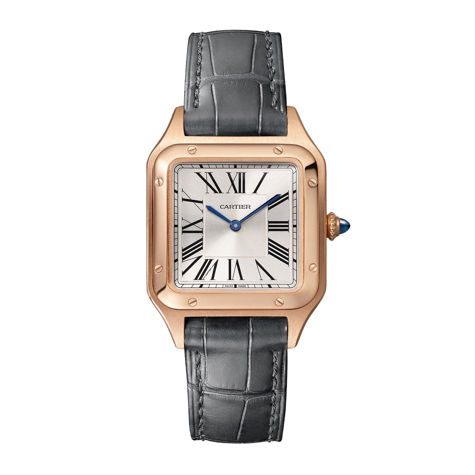 Santos-Dumont watch, small model, high autonomy quartz movement (~ 6 years). 18K rose gold case, beaded crown set with a cabochon- shaped sapphire, silvered satin-brushed dial with sunray effect, Roman numerals, blued-steel sword-shaped hands, sapphire crystal, grey alligator-skin strap, 18K rose gold ardillon buckle. Case dimensions: 38 mm x 27.5 mm, thickness: 7.3 mm. Water-resistant to 3 bar (approx. 30 metres). 1904, Louis Cartier granted the wish of his friend, the famous Brazilian aviator Alberto Santos Dumont: to be able to tell time while flying. Thus, one of the first wristwatches was born. Featuring geometric shapes and exposed screws, the watch quickly became an icon within the House. The Santos collection rises to the ranks of a classic that would defy the hands of time. Explore the full Cartier range here.