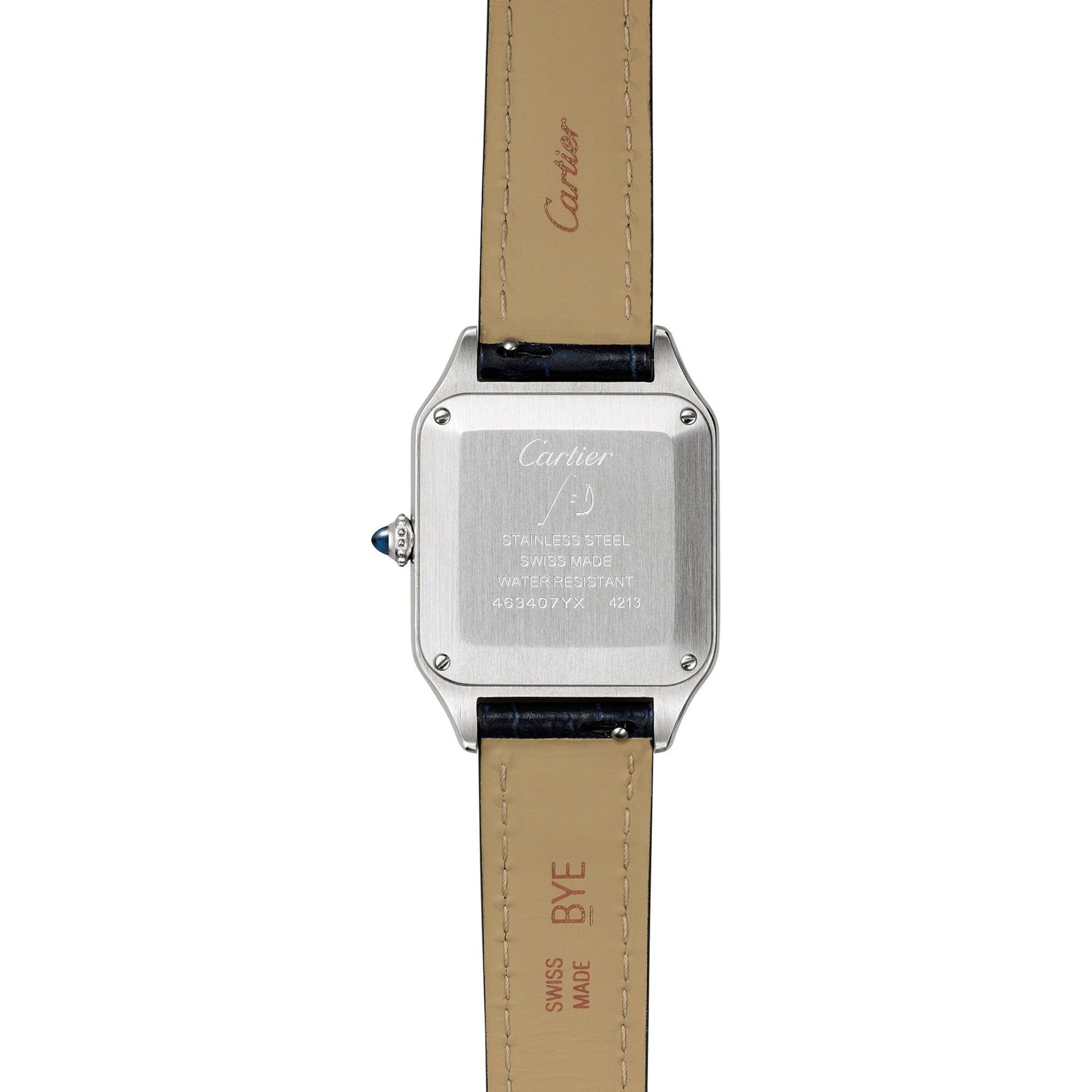 Santos-Dumont watch, small model, high autonomy quartz movement (~ 6 years). Steel case, beaded crown set with a blue synthetic cabochon-shaped spinel, satin-brushed silver dial with sunray effect, Roman numerals, blued-steel sword-shaped hands, sapphire crystal. Strap in navy blue alligator leather, with steel ardillon buckle. Case dimensions: 38 mm x 27.5 mm, thickness: 7.3 mm. Water-resistant up to 3 bar (approx. 30 meters/100 feet). 1904, Louis Cartier granted the wish of his friend, the famous Brazilian aviator Alberto Santos Dumont: to be able to tell time while flying. Thus, one of the first wristwatches was born. Featuring geometric shapes and exposed screws, the watch quickly became an icon within the House. The Santos collection rises to the ranks of a classic that would defy the hands of time. Explore the full Cartier range here.