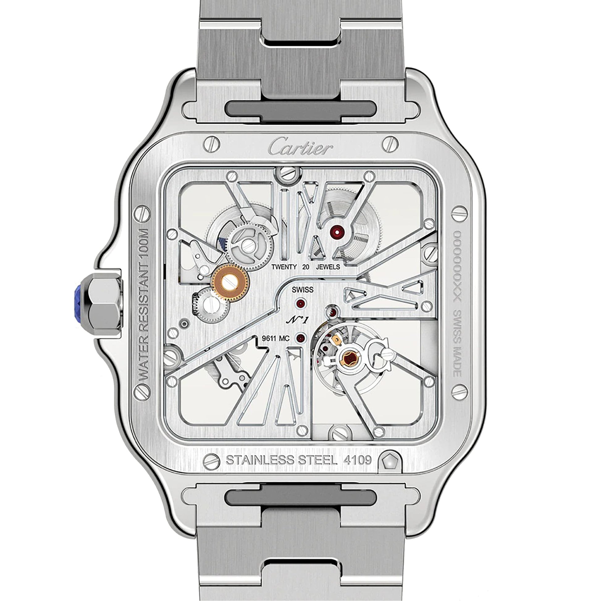 Santos Skeleton watch, large model, Manufacture mechanical movement with manual winding, caliber 9611 MC. Steel case, heptagonal crown set with a faceted sapphire, blued-steel sword-shaped hands, sapphire crystal and case back. Steel bracelet with “SmartLink” adjustment system. Second bracelet in alligator leather, with steel interchangeable deployant buckle. Both bracelets are equipped with the “QuickSwitch” interchangeability system. Hours and minutes with skeletonized bridges forming Roman numerals. Individually numbered movement consisting of 138 parts including 20 rubies. Movement dimensions: 28 mm x 28 mm, movement thickness: 3.97 mm, balance: 28,800 vibrations/hour, power reserve approx. 72 hours. Case width: 39.8 mm, thickness: 9.08 mm. Water-resistant up to 10 bar (approx. 100 meters/330 feet). 1904, Louis Cartier granted the wish of the famous Brazilian aviator Alberto Santos Dumont: to be able to tell time while flying. The birth of one of the first ever wristwatches sealed the bonds of friendship between these two pioneers. The rounded angles of the dial, the seamless curve of the horns, and the exposed screws made for an iconic watch that would inspire countless reinterpretations.