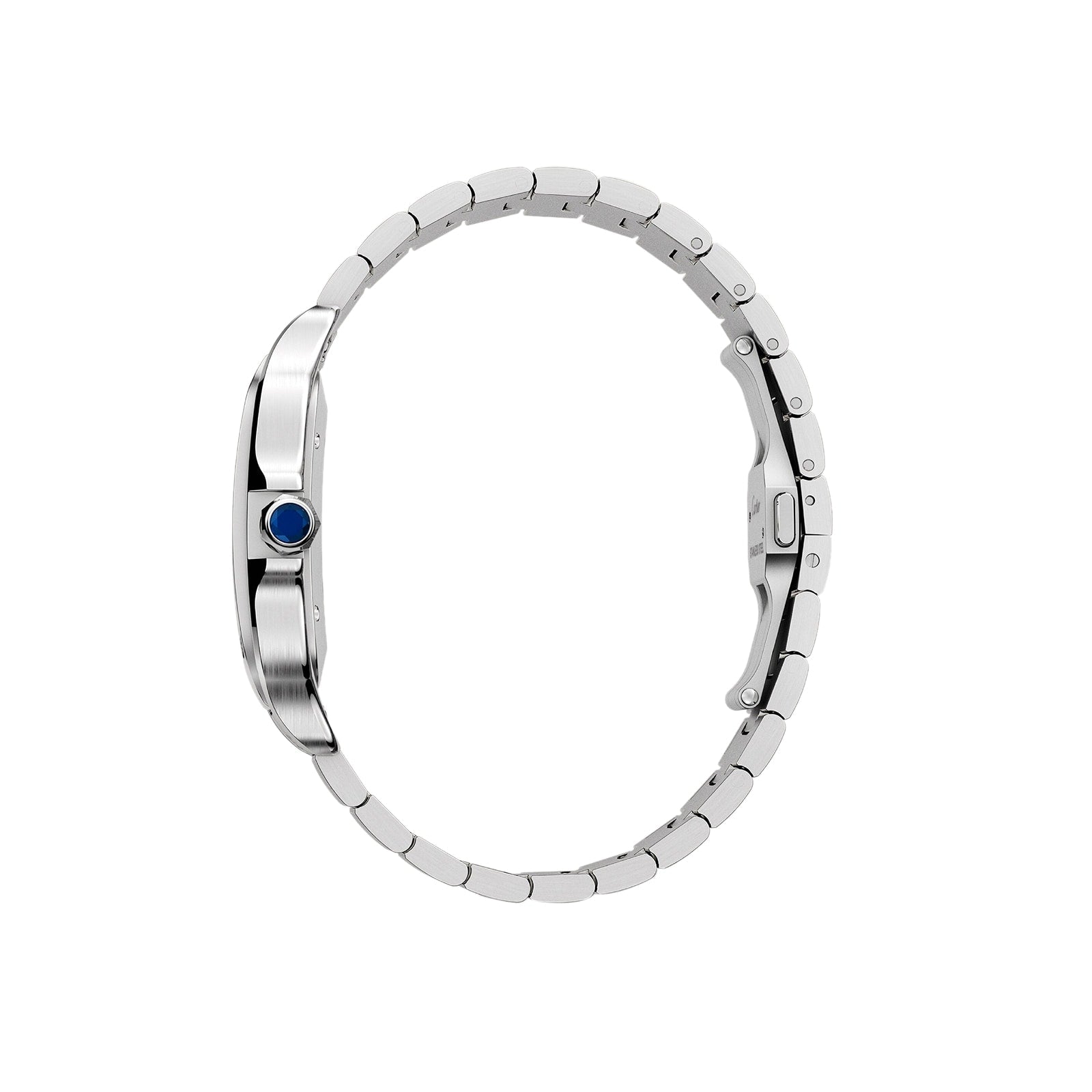 Santos de Cartier - where precision meets minimalism A tribute to aviation innovator Alberto Santos-Dumont Housed in a balanced square steel frame Silvered opaline dial with blued-steel sword-shaped hands and a date display Powered by the calibre 1847 MC self- winding mechanical movement with a 40-hour power reserve HIGH PRECISION MINIMALISM First introduced in 1904, the Santos de Cartier collection honours visionary aviator Alberto Santos-Dumont. Prioritising form, minimalist elegance, precise proportions, and refined detail, the collection is defined by its square case, softened by rounded corners and accented with exposed screws for a bold, functional aesthetic. Although the collection has been updated over the years, it retains the key elements that make it instantly recognisable to aviation enthusiasts and watch collectors alike. FORM AND ELEGANCE Housed in a rounded square steel case, this watch makes a statement with visible functional screws and a distinctive 7-sided crown set with a striking faceted blue spinel. Minimalist and refined, the silvered opaline dial is elevated by steel Roman numerals, a date display at 6 o'clock, and blued- steel sword-shaped steel hands. Complete with two interchangeable straps fitted with the QuickSwitch system- one in brown calfskin and the other in polished steel - this watch can be easily customised to reflect your personal sense of style. Water resistant to 10 bar (100 metres) and powered by the calibre 1847 MC self-winding mechanical movement, this watch balances impressive utility with sophisticated design.