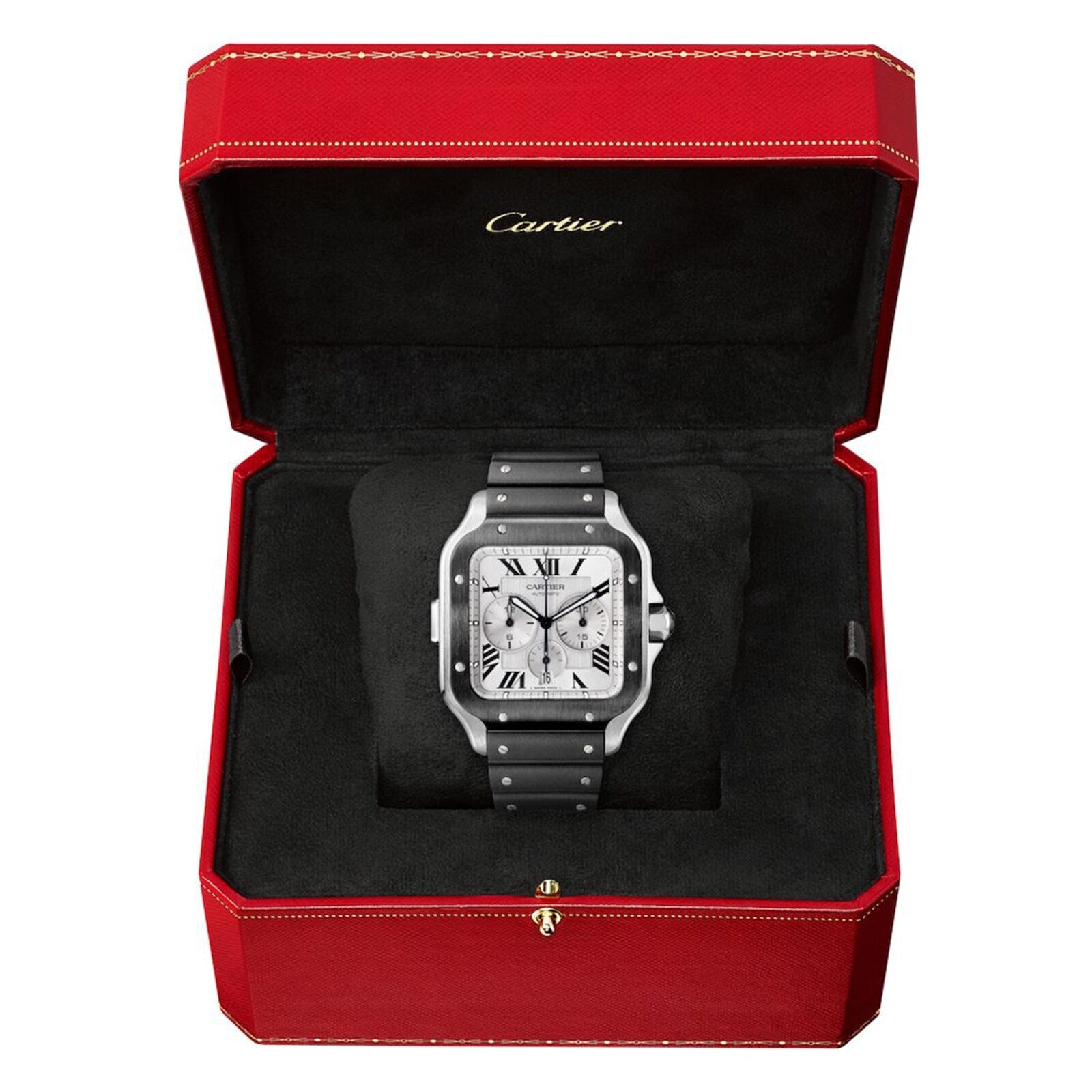 Santos watch, extra large model, chronograph mechanical movement with automatic winding, calibre 1904 CH MC. Steel case, ADLC bezel, 7-sided crown set with a faceted black synthetic spinel, satin-brushed silvered dial, black steel sword-shaped hands with luminescent material, sapphire crystal. First bracelet in rubber, second in black “Gomma” alligator skin, with steel folding buckle. Both bracelets are fitted with the “QuickSwitch” interchangeability system. Case width: 43.3 mm, case thickness: 12.5 mm. Water- resistant to 10 bar (approx. 100 metres). 1904, Louis Cartier granted the wish of the famous Brazilian aviator Alberto Santos Dumont: to be able to tell time while flying. The birth of one of the first ever wristwatches sealed the bonds of friendship between these two pioneers. The rounded angles of the dial, the seamless curve of the horns, and the exposed screws made for an iconic watch that would inspire countless reinterpretations. Explore the full Cartier range here.
