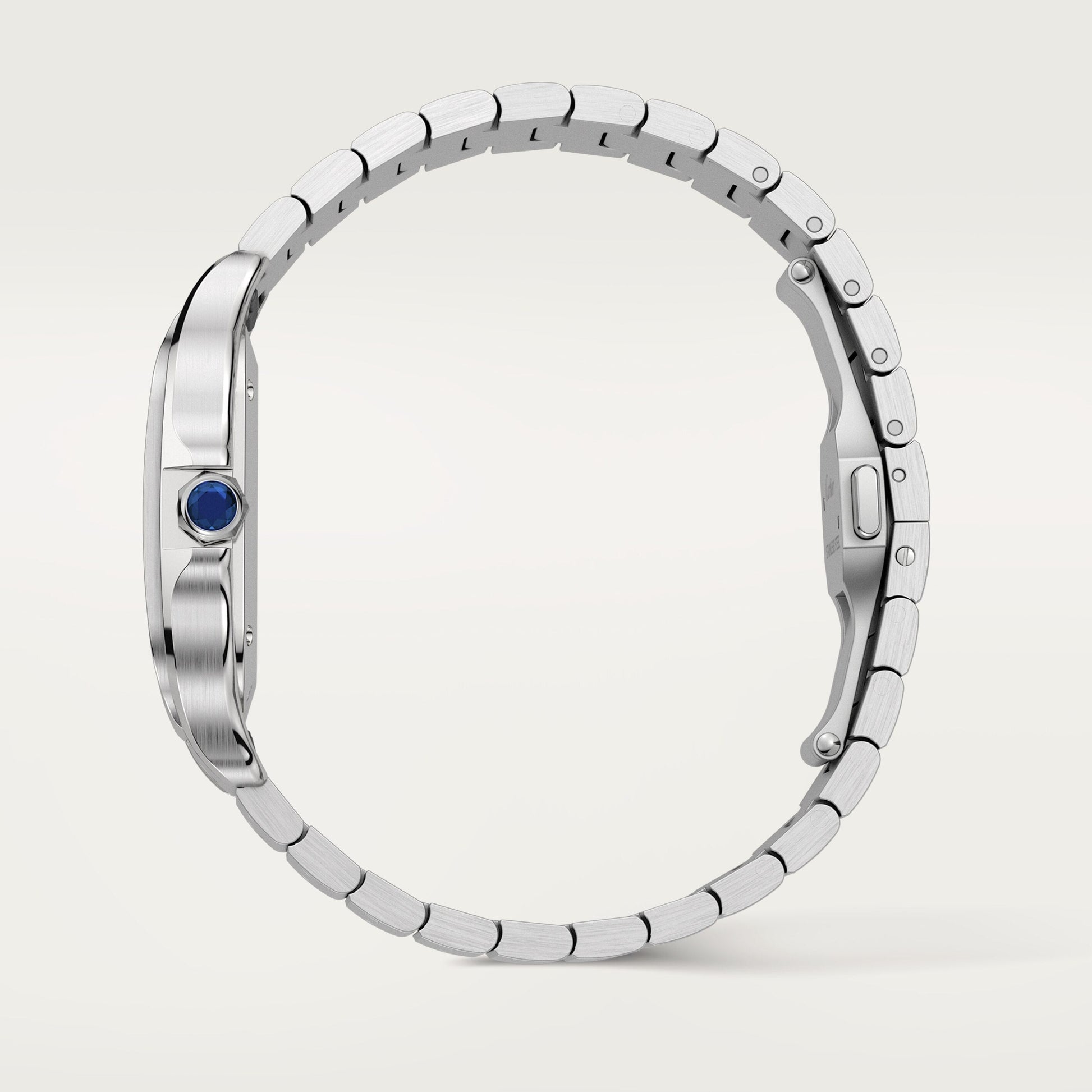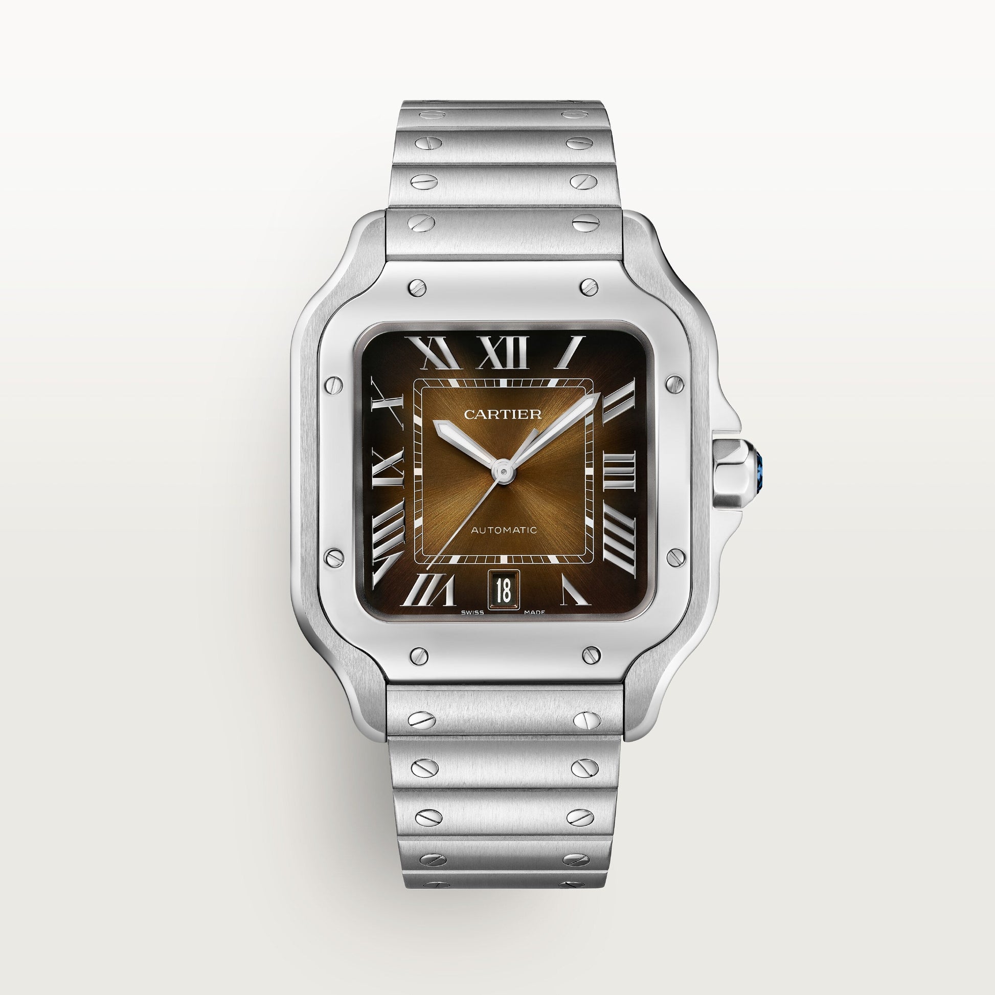 Santos de Cartier offers a sophisticated and elegant timepiece, featuring a strong steel case and a unique 7-sided crown adorned with a blue spinel. The watch is powered by the accurate calibre 1847 MC mechanical movement and boasts a brown sunray-brush ed dial with Roman numerals and rhodium-finish sword hands. Its steel bracelet has a "SmartLink" adjustment system for a perfect fit, and the "QuickSwitch" feature allows for easy interchangeability with an alligator leather strap and steel buckle. Elevate your style with Santos de Cartier.