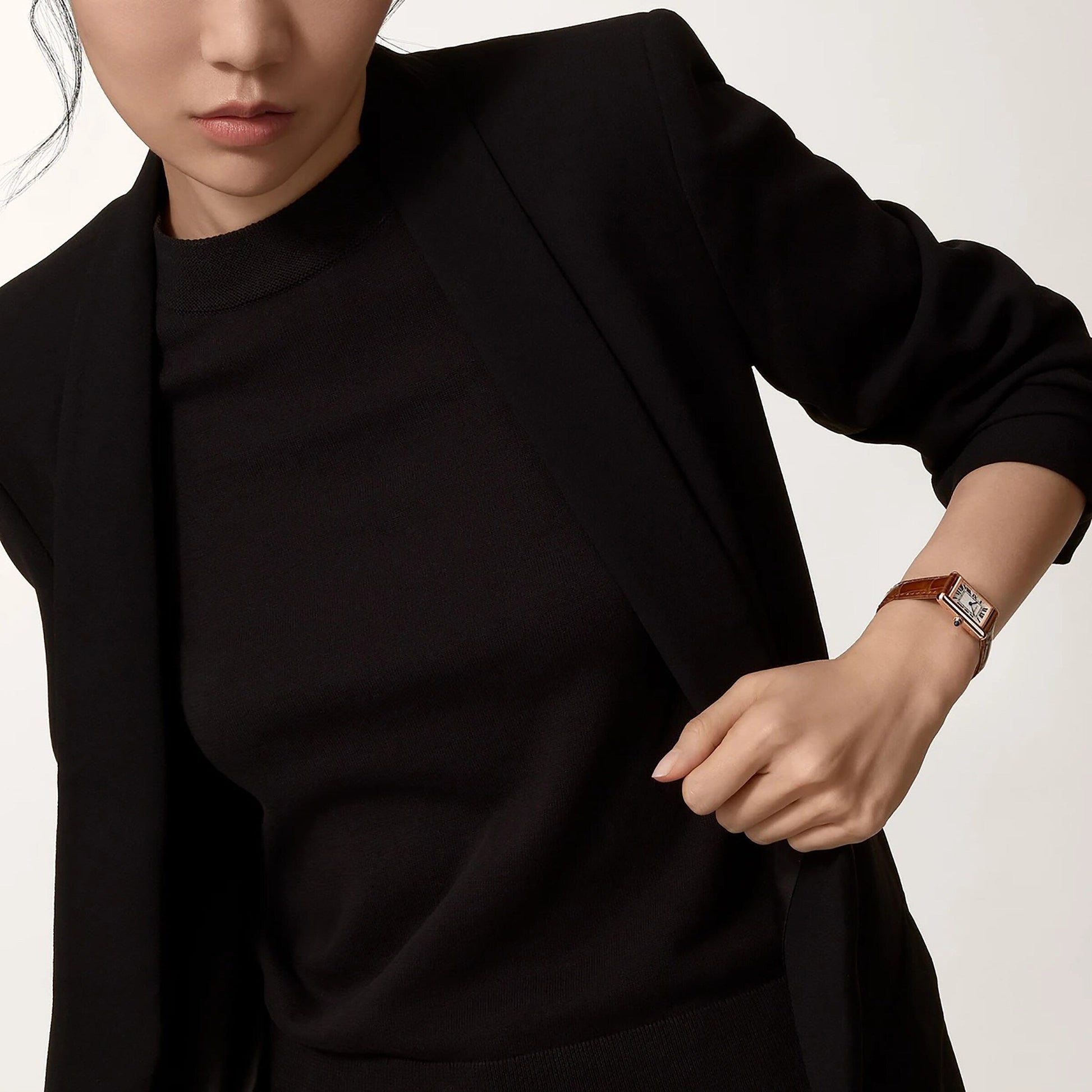 Tank Louis Cartier watch, small model, Manufacture mechanical movement with manual winding, calibre 8971 MC. Case in rose gold 750/1000, beaded crown set with a sapphire cabochon, silvered beaded dial, blued-steel sword-shaped hands, mineral crystal, strap in shiny brown alligator skin, ardillon buckle in rose gold 750/1000. Case dimensions: 29.5 mm x 22.0 mm, 6.8 mm thick. Water- resistant to 3 bar (30 metres).